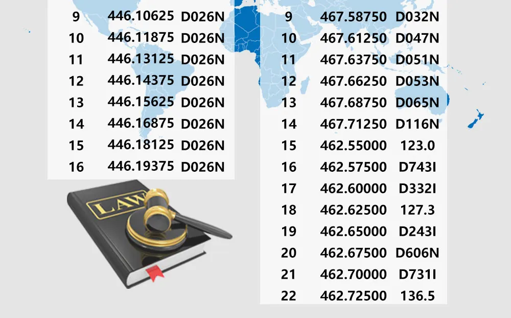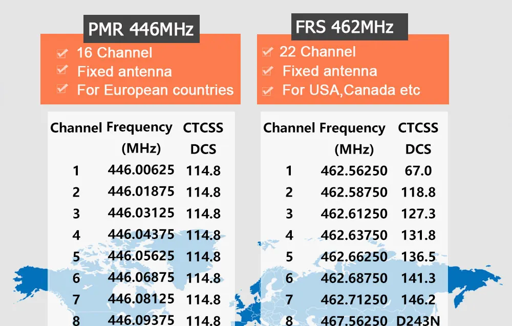 Конфигурация самой рации точно такая же. Разница между двумя версиями-это Заводская частота и настройки питания. PMR заводским настройкам по умолчанию является 0,5 W, 446 МГц; FRS заводским настройкам по умолчанию составляет 2 Вт, 462 МГц.PMR является стандартом частоты европейских стран, и FRS является стандартом американских стран, таких как Канада и Соединенные Штаты.Для других стран, если необходимо изменить частоту, обязательно Приобретите соответствующий кабель для программирования.