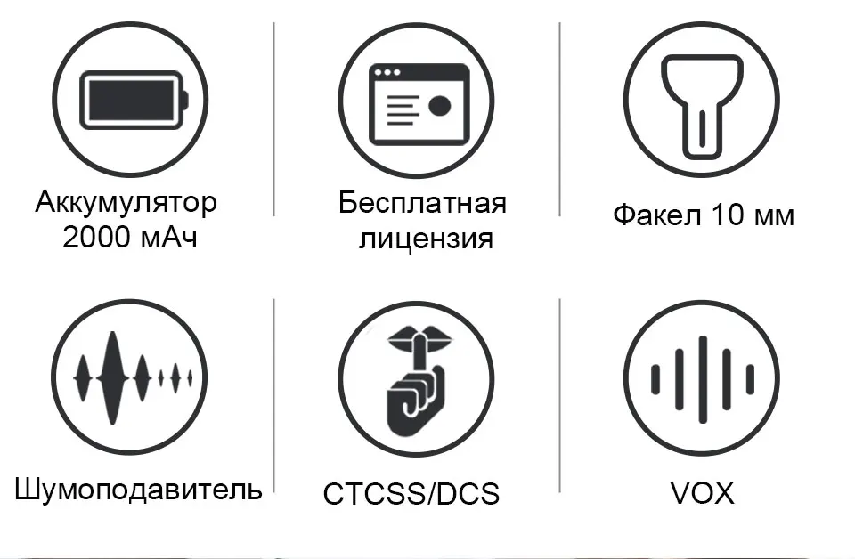Беспроводное соединение BluetoothМощный светодиодный фонарьМониторФункция сигнализацииVOX (поддерживает bluetooth наушники)VOX Функция задержкиПанелька для замочной скважиныСканированияГорячее предложениеТип-C Зарядное устройствоБеспроводная копия: Беспроводная передача данных между рациями без программного обеспечения программирования.