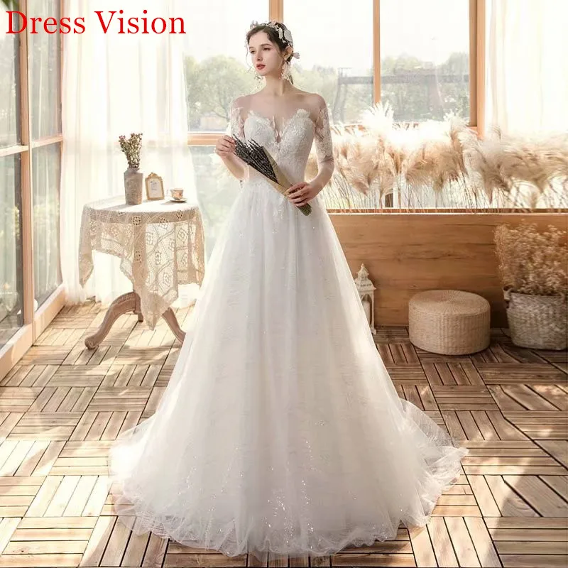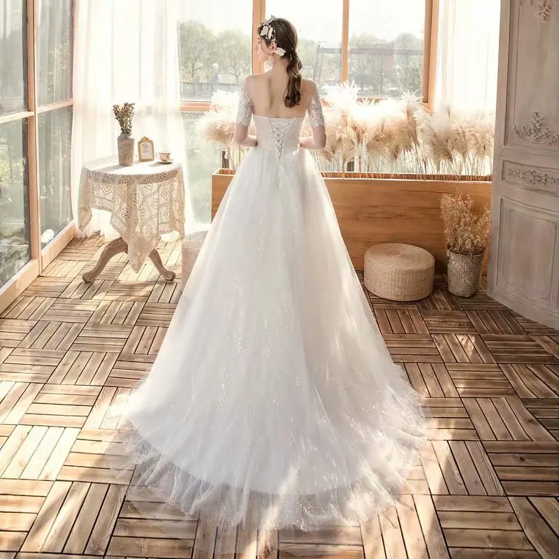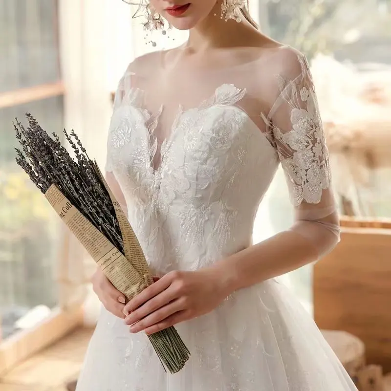 Женское Свадебное платье из прозрачного тюля, кружевное свадебное платье с коротким рукавом и глубоким круглым вырезом, платье для невесты