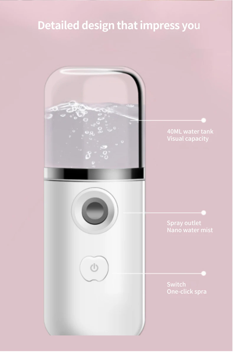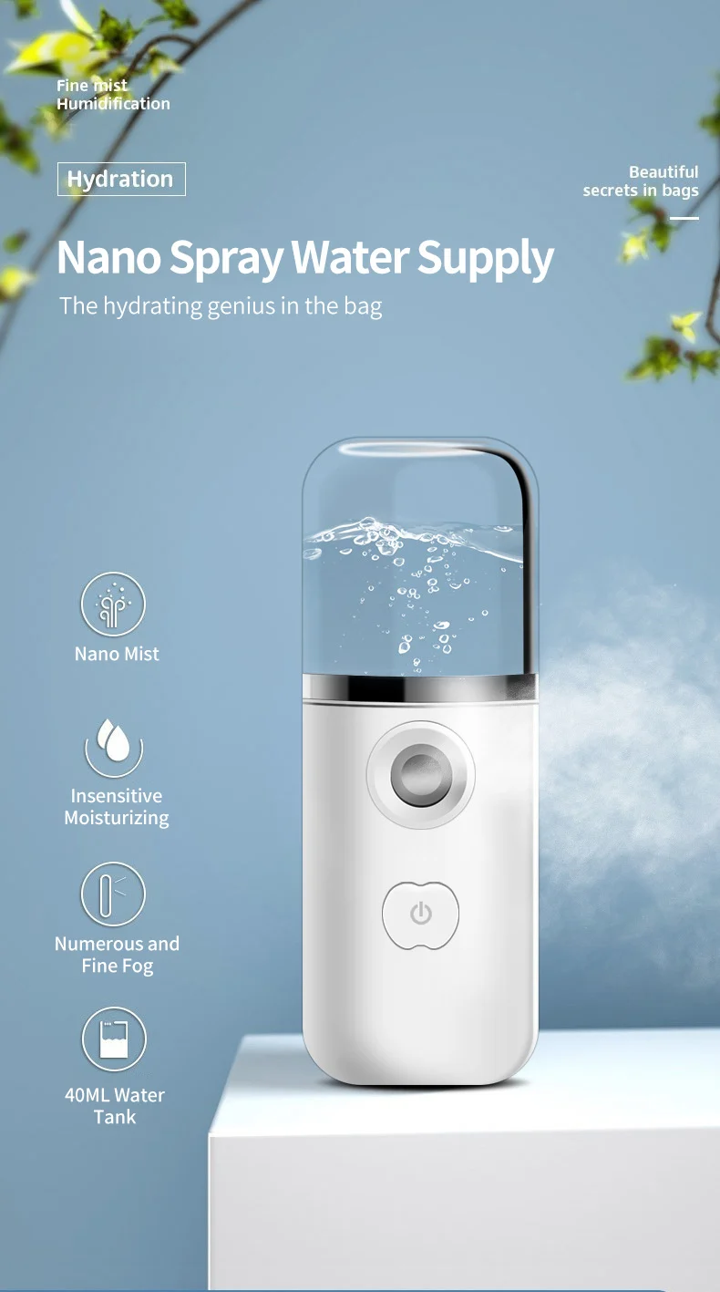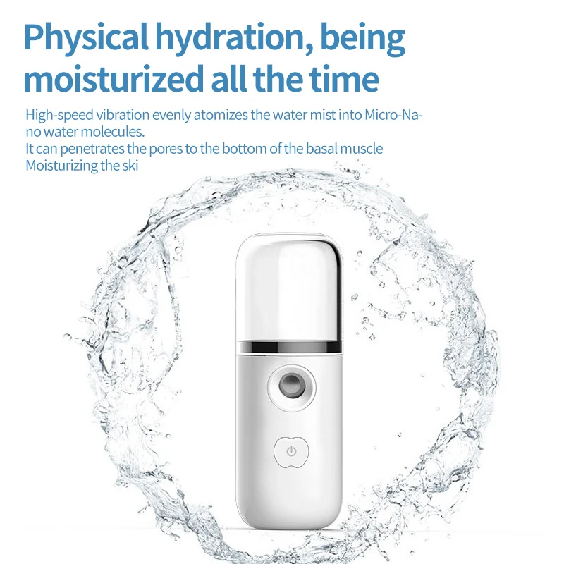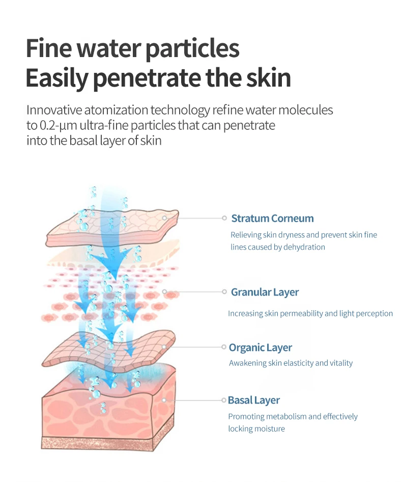 Быстрое поглощение питательных веществ; Увлажнение без нанесения макияжа; Помогает экономить 50% косметики; Светильник портативный; Мелкие частицы воды; Легко проникает в кожу.