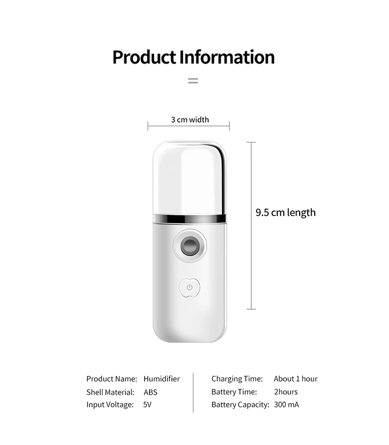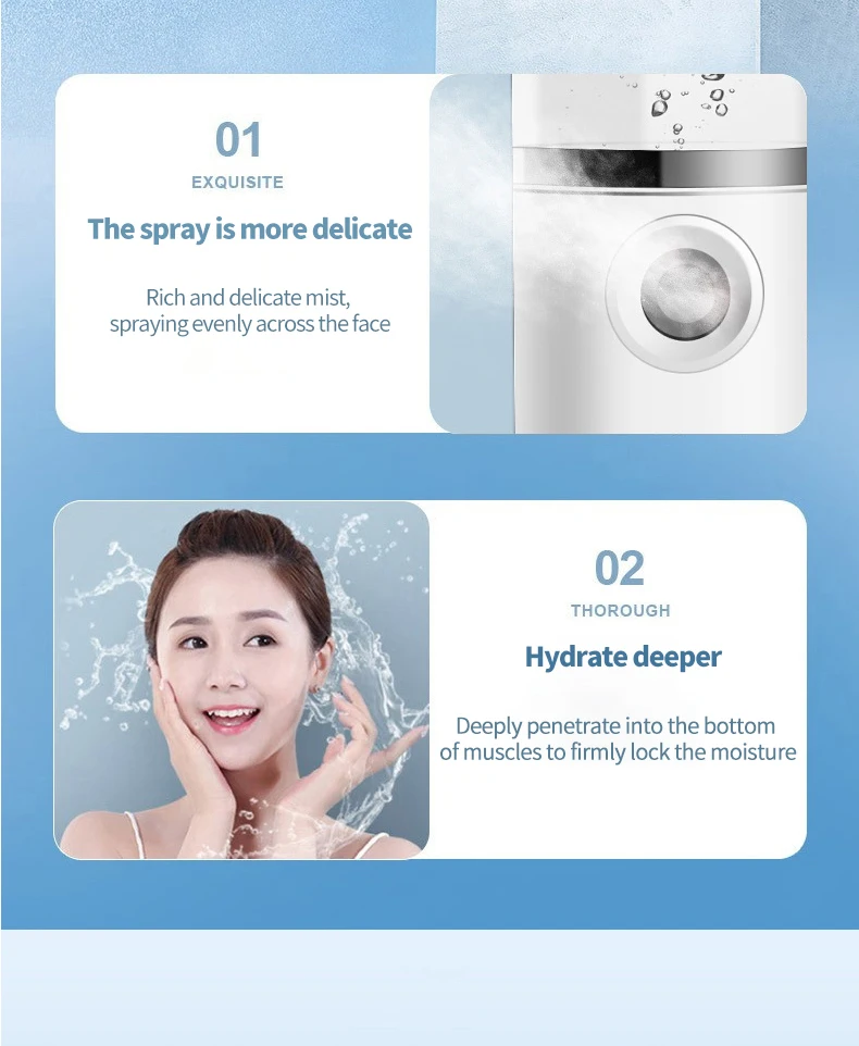 Этот распылитель для лица с большим резервуаром для воды может проникать глубоко в кожу и оживлять кожу. Распыленные частицы более деликатны и легко впитываются лицом. Увлажняет кожу, не смазывая макияж. Вместо чистой или дистиллированной воды Используйте натуральную минеральную воду. Если плотность воды слишком высокая или слишком низкая, это может привести к комку или засорению.