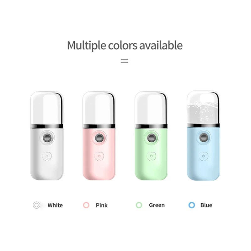 Тип: распылитель тумана для лица Цвет: белый/синий/зеленый/розовый Материал: АБС-пластик Емкость аккумулятора: 280ма Входное напряжение: 5 В Время зарядки: 1 час Размер изделия: 39 мм × 30 мм × 100 мм Емкость резервуара для воды: 40 мл Вес: 60 г