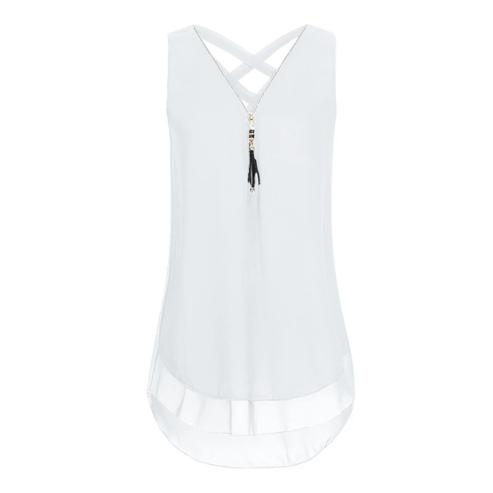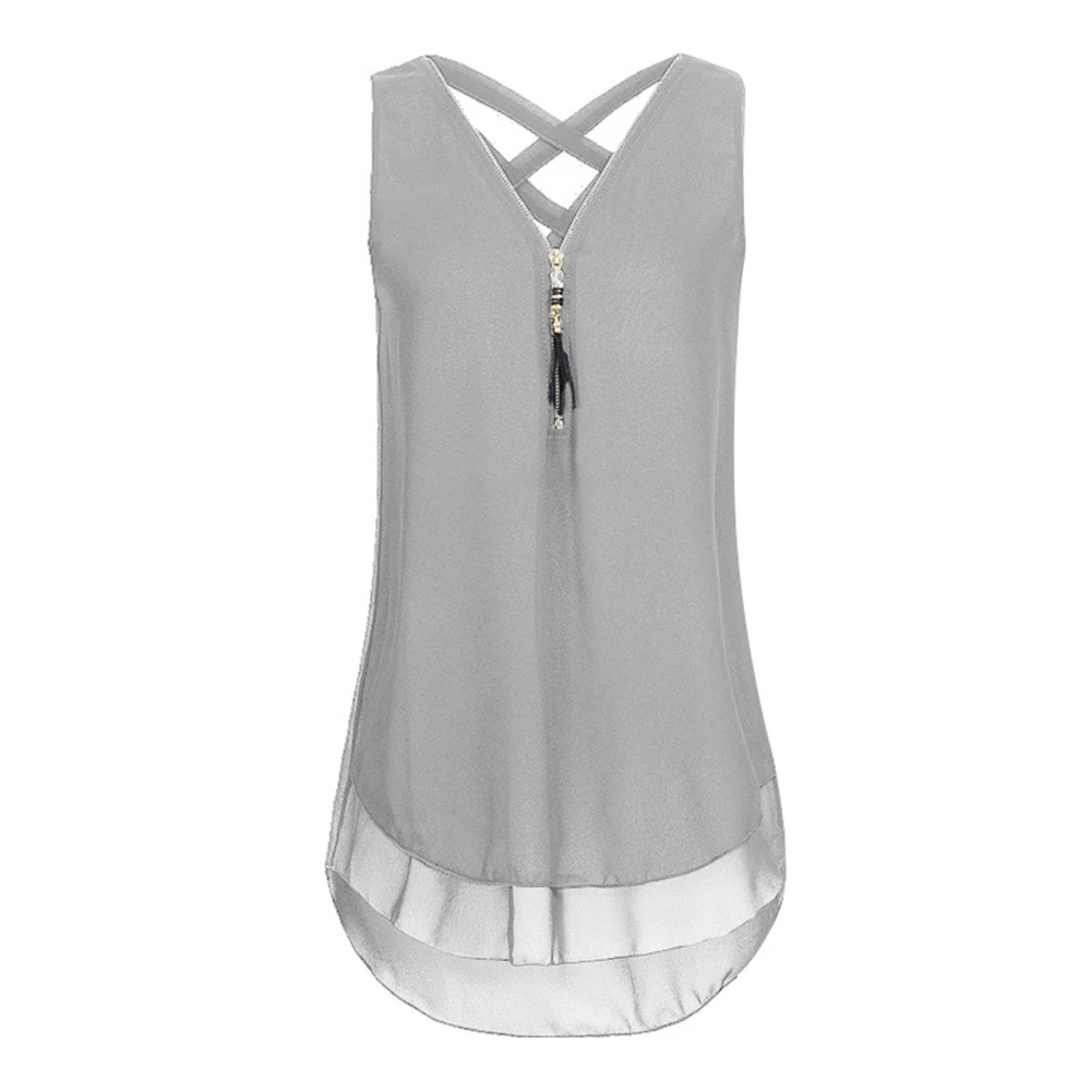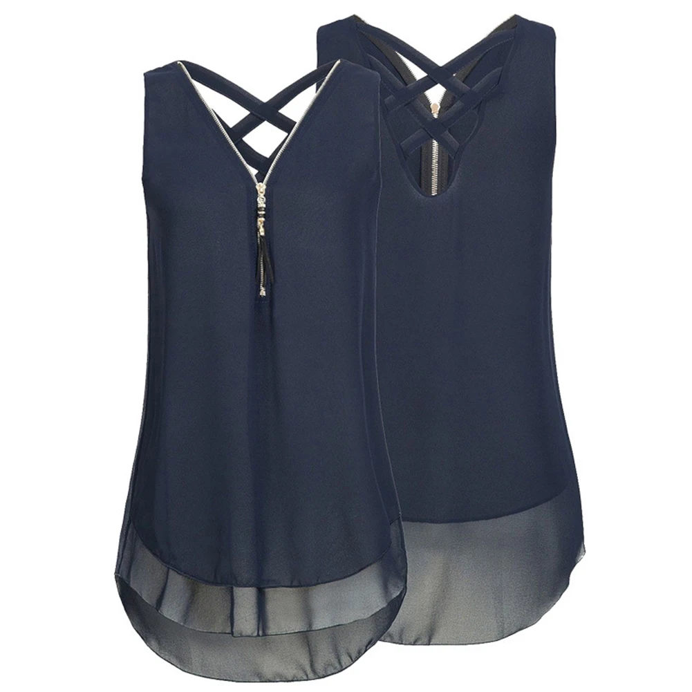 Женская шифоновая блузка на молнии, Повседневная летняя Свободная майка без рукавов с V-образным вырезом, однотонный топ на молнии, 2021