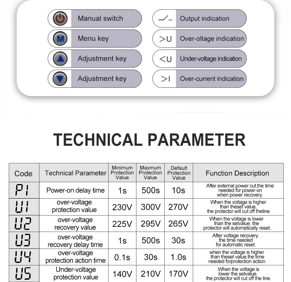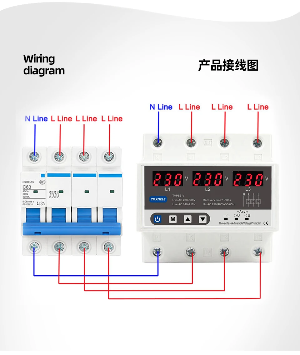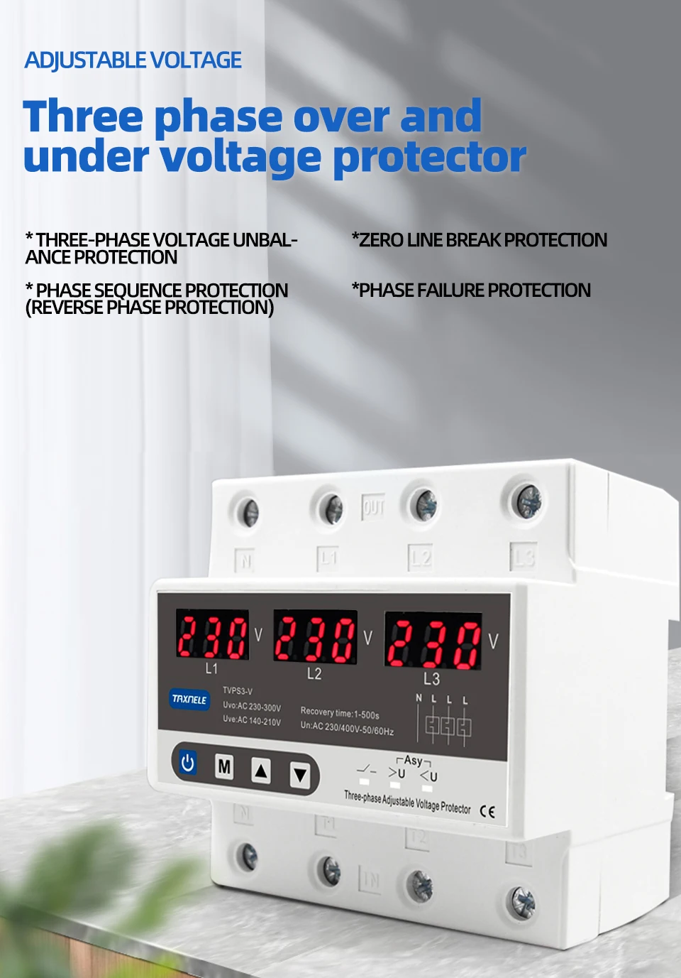 Трехфазное многофункциональное устройство защиты от перенапряжения переменного тока 380 В 400 в 63 а автоматическое реле восстановления напряжения Функции: 1. Защита от перенапряжения 2. Защита от пониженного напряжения 3. Автоматическое восстановление 4. Отображение напряжения (измерение напряжения) 5. Трехфазная защита от неравновесия ампер 6. Защита последовательности фаз (защита от обратной фазы) 7. Защита от разрыва нулевой линии 8. Защита от фазового сбоя Параметры продукта: 1. Номер модели: TVPS3-V 2. Источник питания: 3*230 В/400 В переменного тока, 50/60 Гц 3. Макс. Мощность загрузки: 63А 4. Диапазон значений защиты от перенапряжения: 230 В ~ 300 регулируемый (по умолчанию: 270 в) Диапазон значений восстановления перенапряжения: 225 в ~ 295 в (по умолчанию 265 В) Время действия защиты от перенапряжения: 0,1 ~ 30 секунд (по умолчанию 1) 5. Диапазон значений защиты от пониженного напряжения: 140 в ~ 210 в, регулируемый (по умолчанию: 170 в) Диапазон значений восстановления под напряжением: 145 В ~ 215 в (по умолчанию 175 в) Время действия защиты от пониженного напряжения: 0,1 ~ 30 секунд (по умолчанию 1 с) Разбалансированное значение защиты от напряжения 6,3 фаз: Регулировка 20-95 в, ВЫКЛ. 7. Время задержки после включения питания: 1 ~ 500 секунды (по умолчанию: 10 с) 8. Время задержки восстановления: 1 ~ 500 с (по умолчанию: 30 с) 9. Установка: DIN-рейка 35 мм