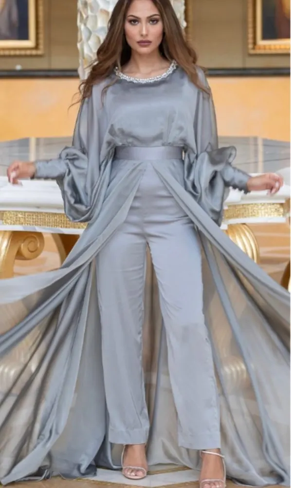 Вечернее платье с юбкой-годе, серое, из Дубая, с высоким воротом, к...