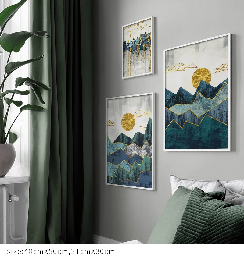 Настенная картина в скандинавском стиле с абстрактным геометрическим изображением горного пейзажа, холст с изображением золотого солнца, Настенная картина для гостиной