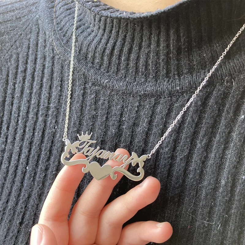 Ожерелье с именем сердца и бабочкой на заказ с лентой и именной табличкой из нержавеющей стали для женщин, ручная работа, кулон, цепочка с буквами, ювелирные изделия