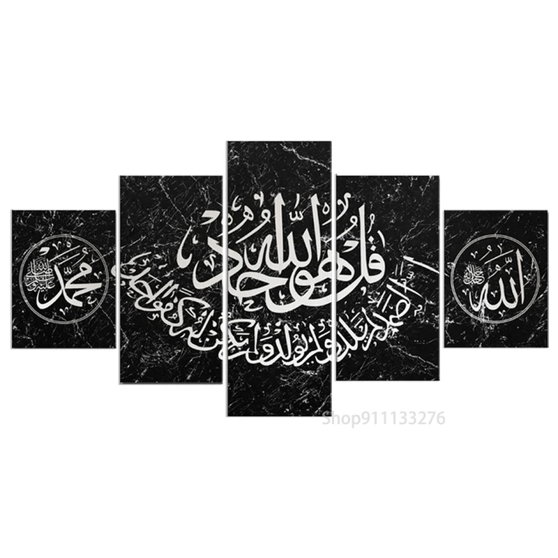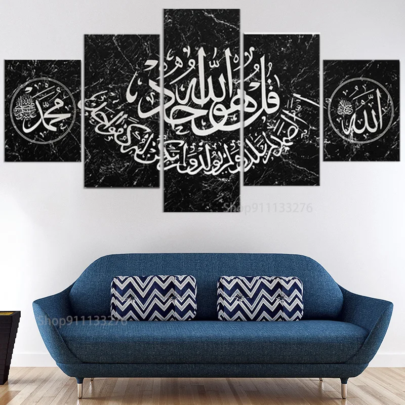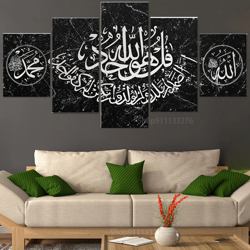 Surah Ikhlas арабский Коран Каллиграфия, 5 панелей, мусульманский настенный плакат и принты, Аллах, мусульманский домашний декор, холст, картина, рамка