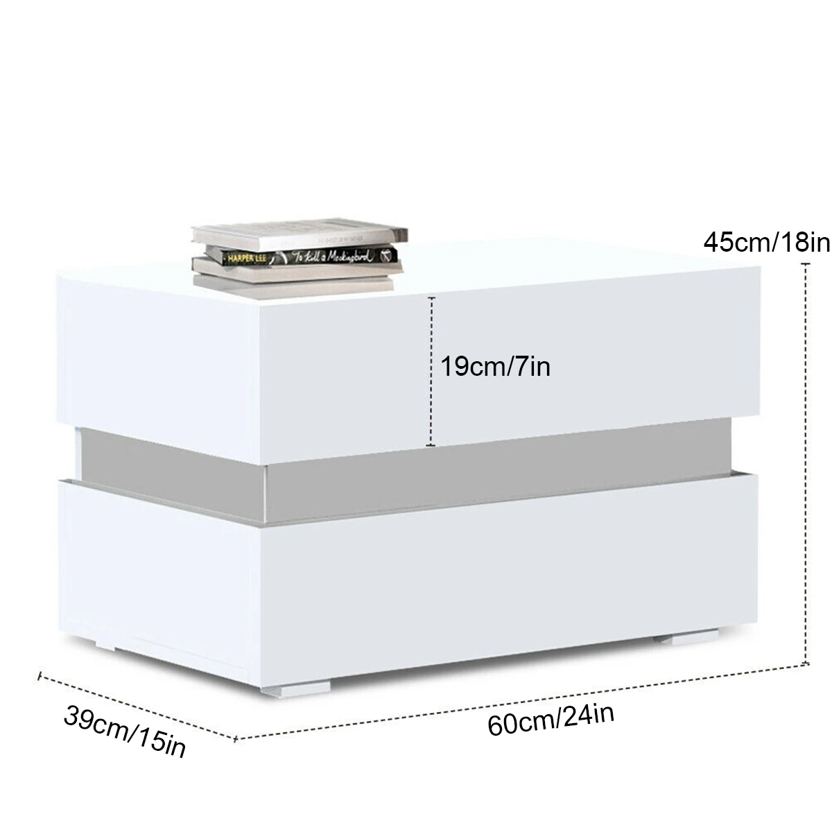 Особенность:-Современный стиль, классический внешний вид-чрезвычайно элегантный и абсолютно великолепный.-Поставляется с двумя ящиками, которые удобны для хранения.-Прочный и очень прочный подшипник.-Отличное качество, идеально подходит для небольших помещений.-Высококачественная Глянцевая УФ-триаминовая плита.-С элементами из витражного стекла спереди и по бокам.-Прикроватный шкаф поставляется в комплекте с многоцветной (20 цветов) светодиодной подсветкой (пульт дистанционного управления для изменения цвета входит в комплект).-Изготовлен из высококачественного материала.-Портативный и легкий для удобной транспортировки.-Простая сборка с помощью описанных инструкций.-Легко чистить.-Журналы, книги, чашки и украшения можно разместить на поверхности стола для легкого доступа.