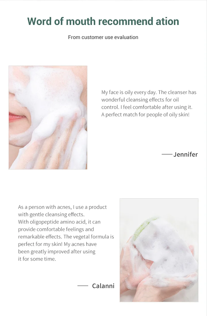 Мое лицо жирное каждый день. Очищающее Средство обладает прекрасными очищающими эффектами для контроля жирности. Мне комфортно после использования. Идеальное сочетание для людей с жирной кожей!--- Дженифер ЛопесКак человек с acnes, я использую продукт с мягкими очищающими эффектами. С олигопептидной аминокислотой он может обеспечить комфортные ощущения и замечательные эффекты. Растительная формула идеально подходит для моей кожи! Мой acnes был значительно улучшен после использования в течение некоторого времени.--- Подача заявки на Calanni