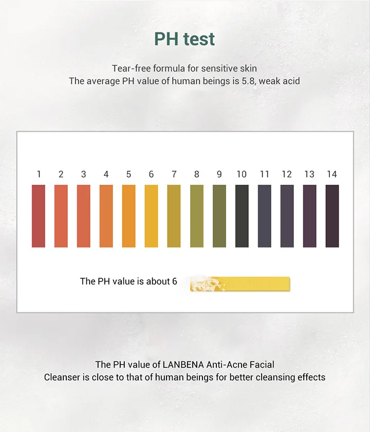 PH ТестФормула без разрывов для чувствительной кожиСреднее значение рН у людей составляет 5,8, слабые кислотыЗначение PH LANBENA анти-акне очищающее средство для лица близкое к значению человека для лучшего очищения эффектовЗначение PH около 6