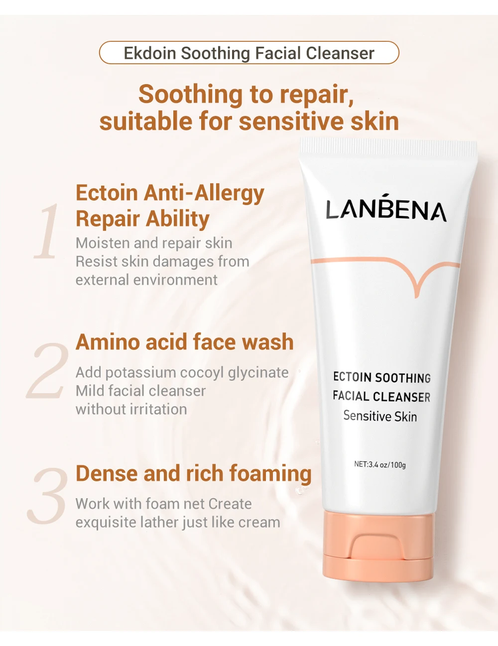 LANBENA эктоин очищающее средство для лицаУспокаивающий для восстановления, подходит для чувствительной кожи1.Ectoin Анти-аллергия ремонтная способностьГлубоко увлажняет и восстанавливает кожуЗащищает кожу от повреждений внешней среды2. Аминокислоты для умывания лицаС калия кокоил глицинатМягкое очищающее средство для лица без раздражения3. Плотный и насыщенный пеноматериалРабота с поролоновая сеткаСоздайте изысканную пену, как крем