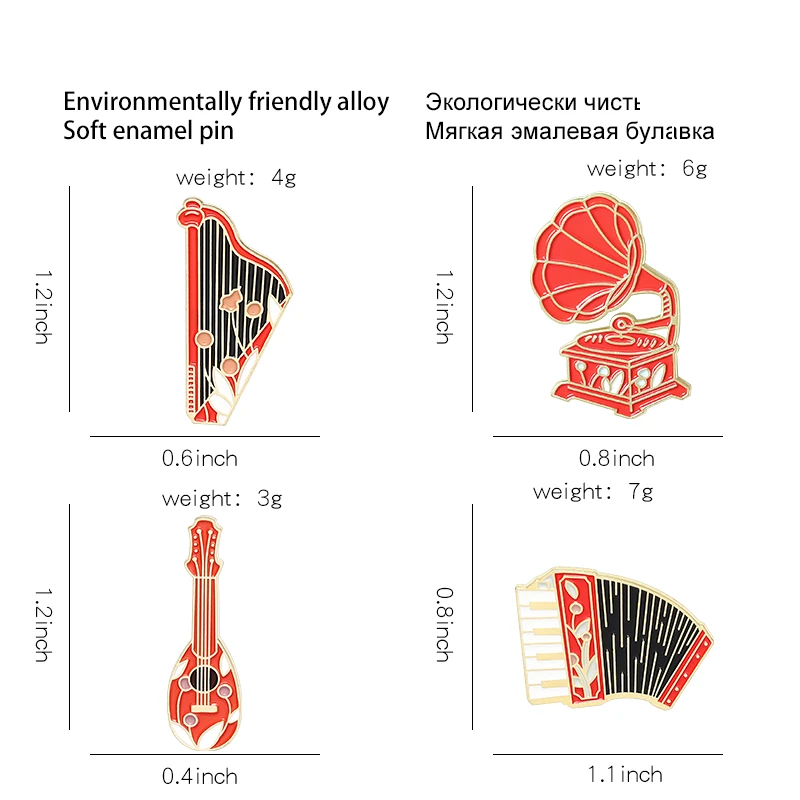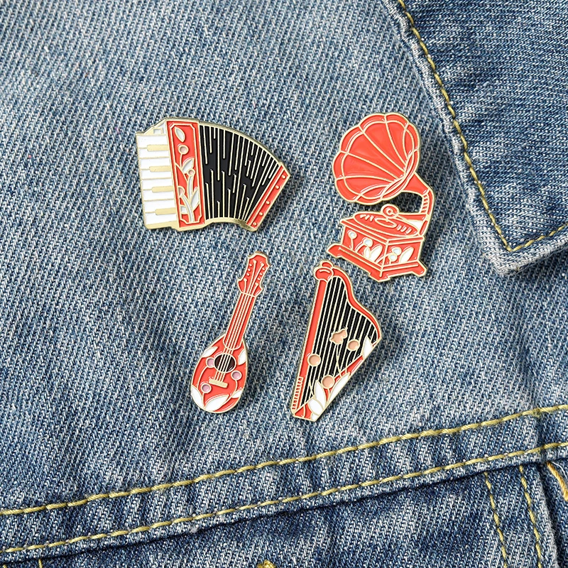 Винтажная эмалированная булавка для гитары на заказ, фонограф, гармошка, арфа, инструмент, брошь на рюкзак, музыкальный значок, ювелирные изделия, подарок для друзей 2021