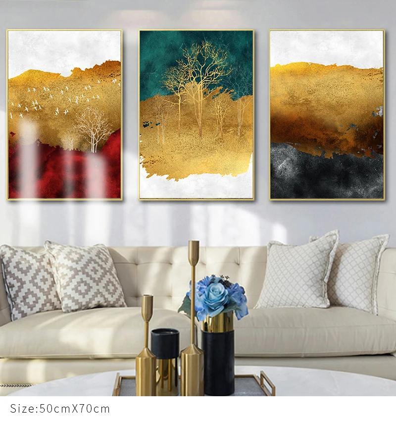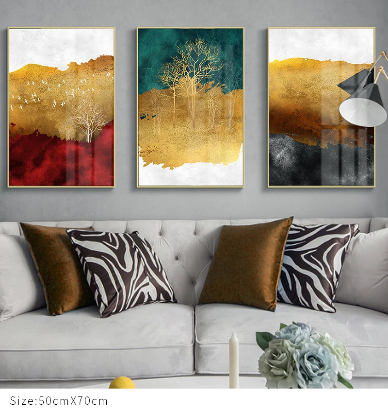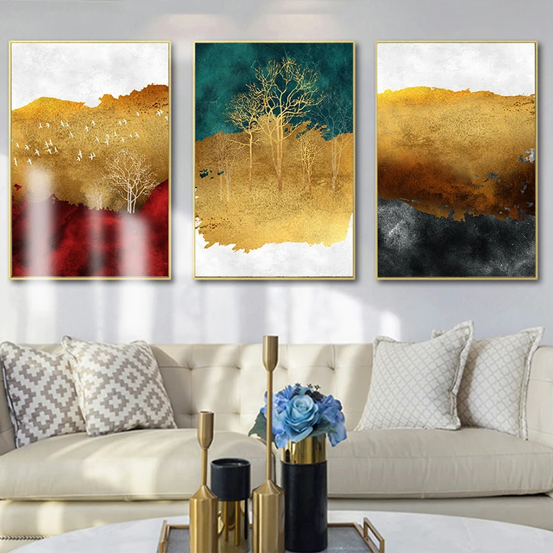 Настенная картина с абстрактными золотыми деревьями в скандинавском стиле, красный и зеленый постер на холсте, Современный домашний декор для гостиной, спальни