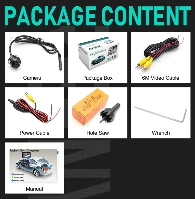 1 * Автомобильная камера переднего/заднего вида1 * видео кабель1 * кабель питания1 x кольцевая пила