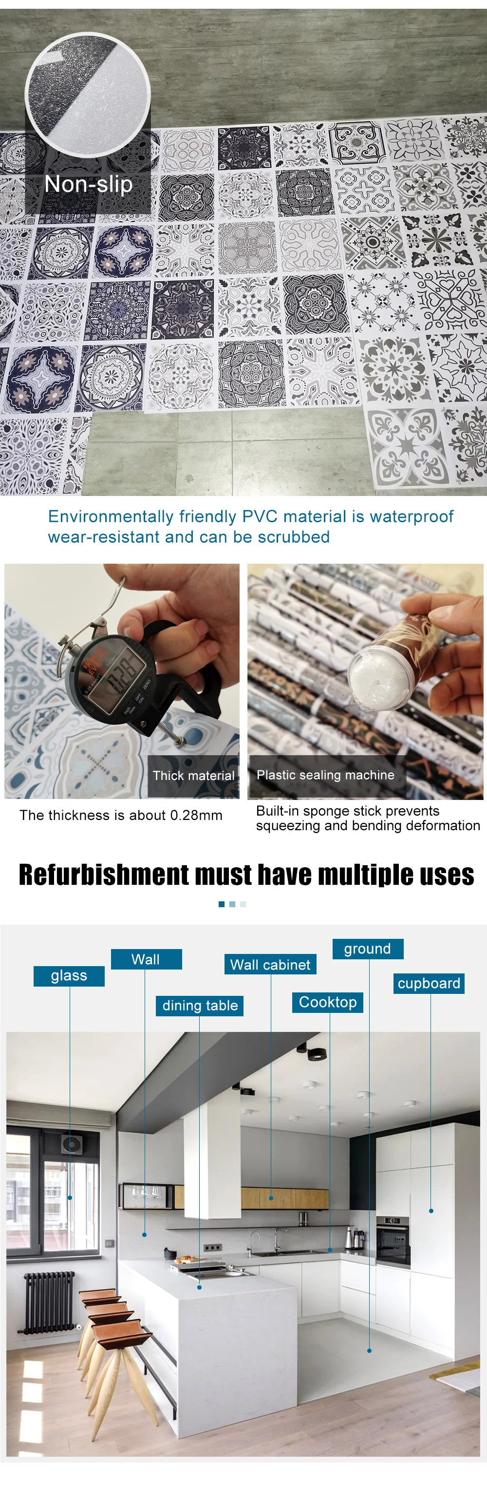 Полученный размер: 50*100 смМатериал изделия: экологичный ПВХОсобенности:1. Толстый материал, толщина около 0,28 мм2. На поверхности имеется слой матовой пленки, которая не скользит, износостойкая и грязеотталкивающая.3. Материал экологически чистый водонепроницаемый ПВХ материал, упакованный в полиэтиленовый пакет. 10 штук в упаковке4. Самоклеющиеся, оторвать защитную бумагу на спине и вставить непосредственно. Очень удобно5. Может быть удален, клей не остается после разрыва и может быть повторно использован. Клей очень прочный. Необходимо разместить на плоской поверхности6. Очистите землю перед приклеиванием к земле. Не должно быть золы и воды, иначе это повлияет на эффект прилипания.7. Он может быть украшен в любом месте: кухня, гостиная, шкаф, шкаф, стол, ТВ фоновая стена, спальня, ванная комната и т. Д.Совет: пожалуйста, приобретайте достаточное количество товаров одновременно, чтобы избежать неудобств при покупке двух цветов.