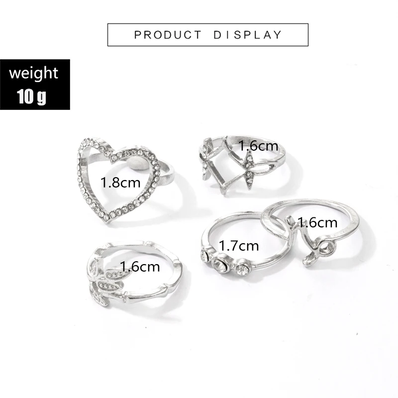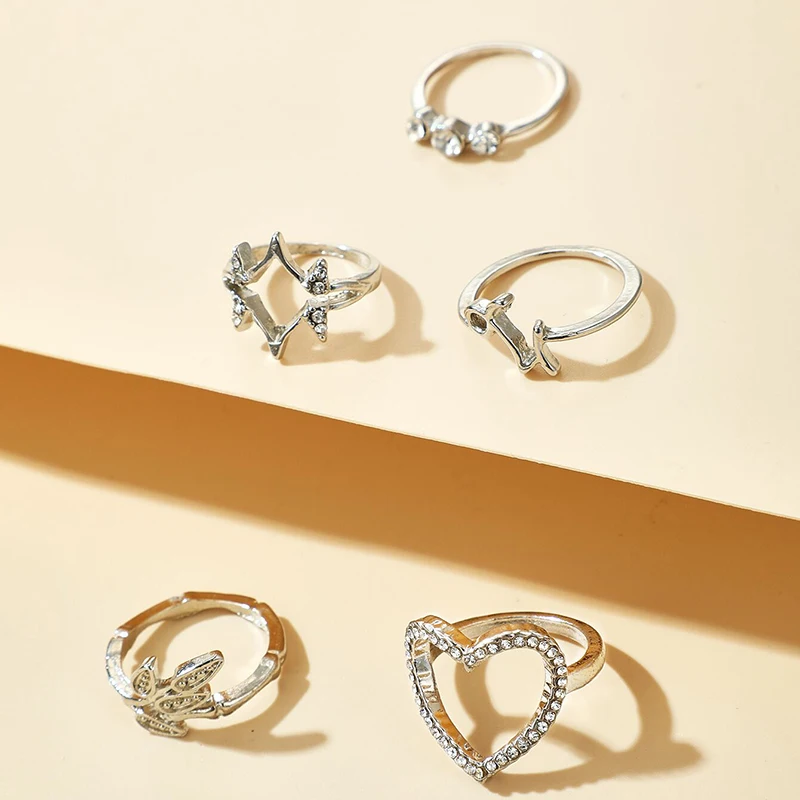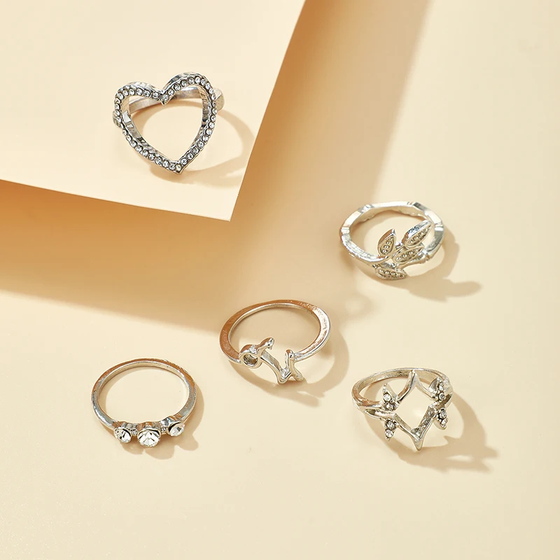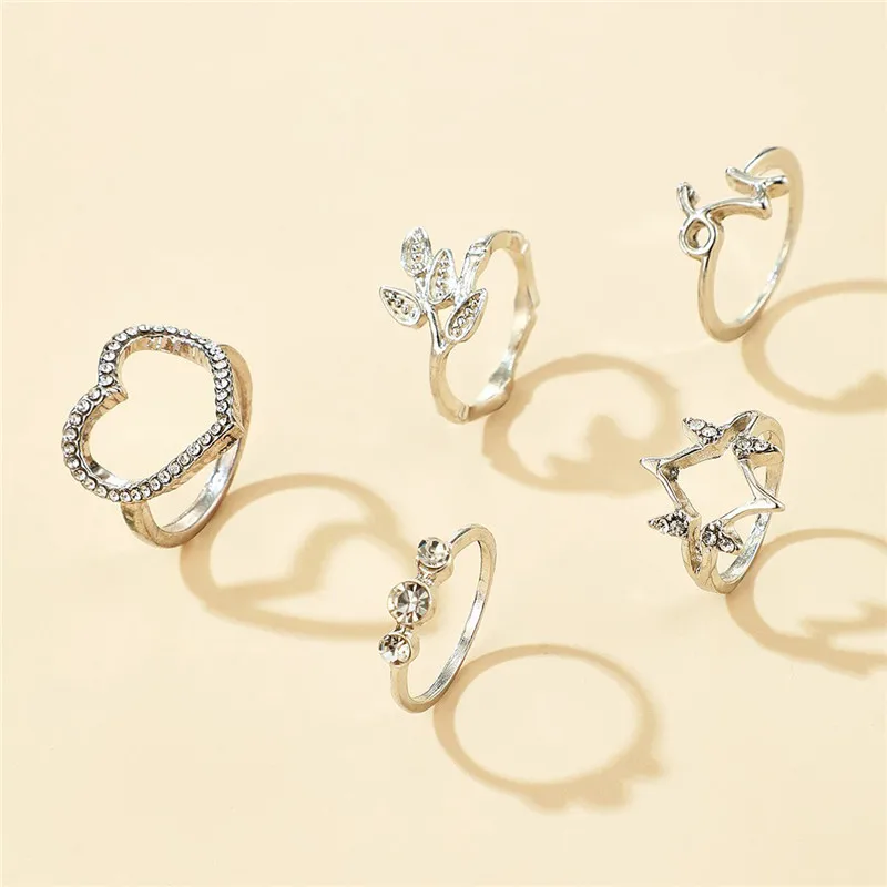 HuaTang 5 шт.компл. модные хрустальные кольца в форме сердец, комплект ювелирных изделий для женщин с геометрическим рисунком серебристый лист Тарельчатая женские вечерние ювелирные изделия Anillos