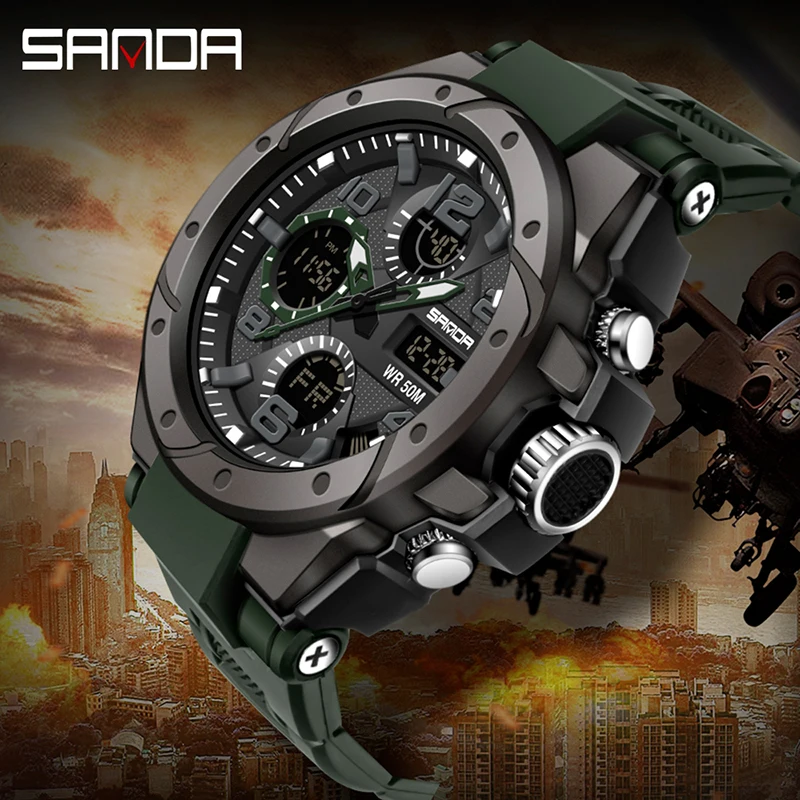 Часы наручные SANDA Мужские Цифровые, Брендовые спортивные модные ударопрочные с секундомером, с двойным временем подсветки, подарок