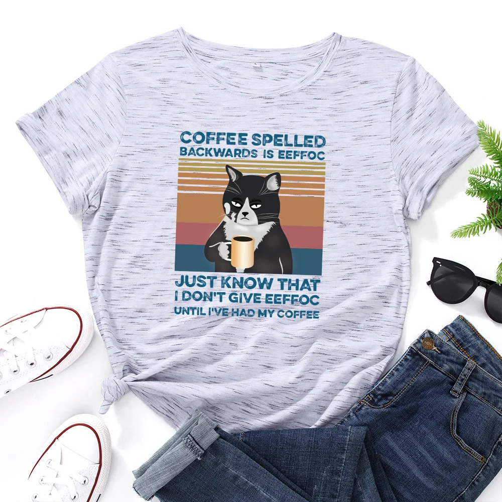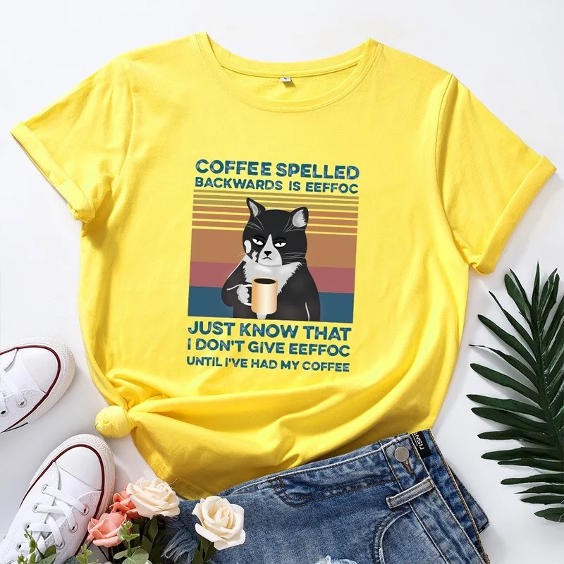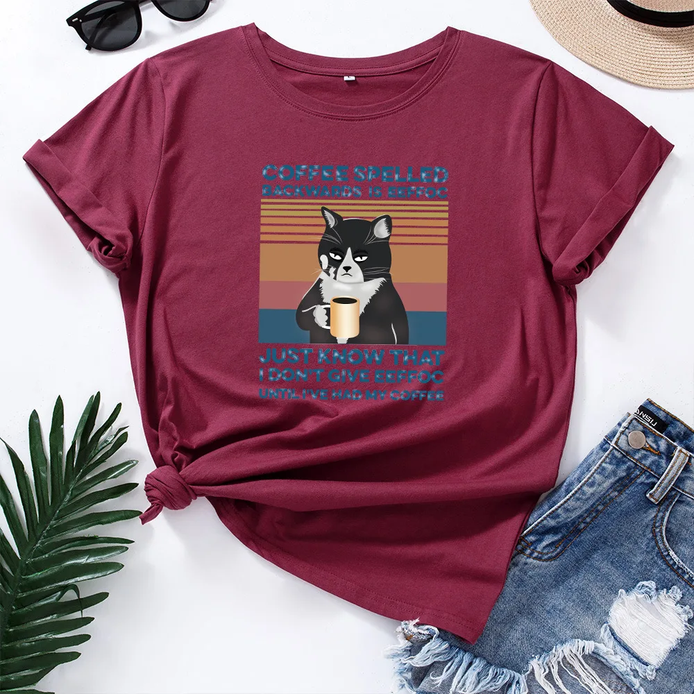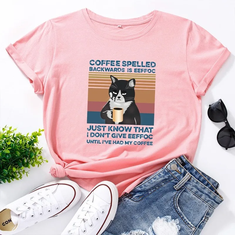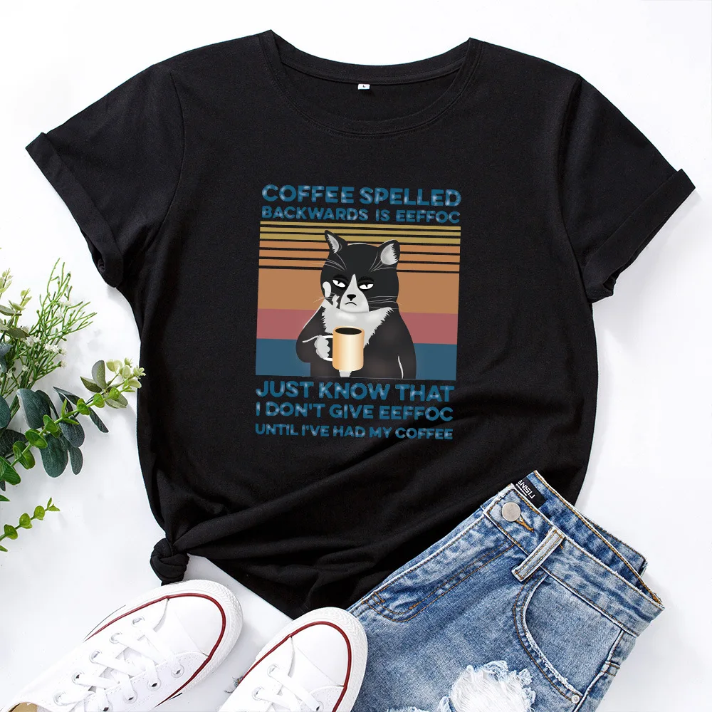 Летняя Хлопковая женская футболка 5XL, размера плюс, с принтом кофейного кота, с коротким рукавом, с графическим рисунком, повседневная женская футболка большого размера с круглым вырезом