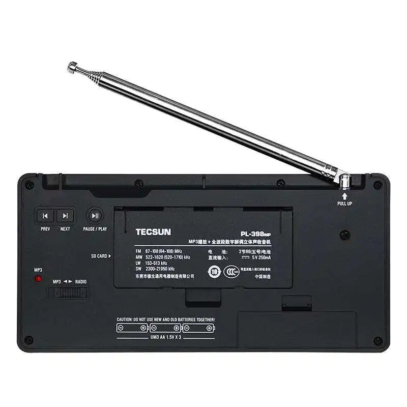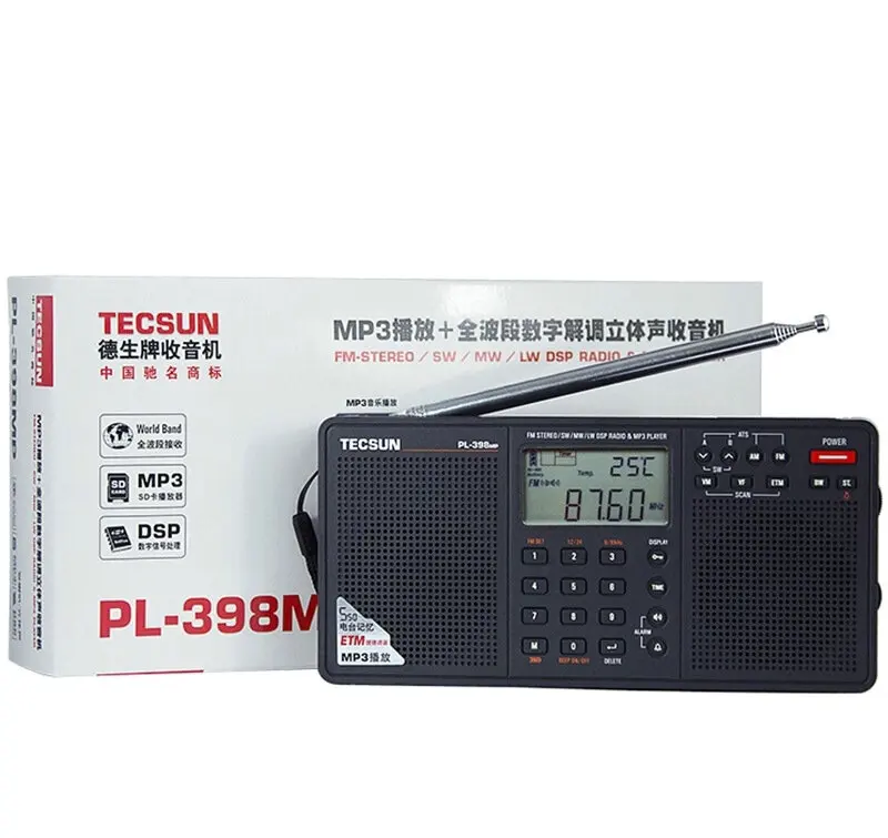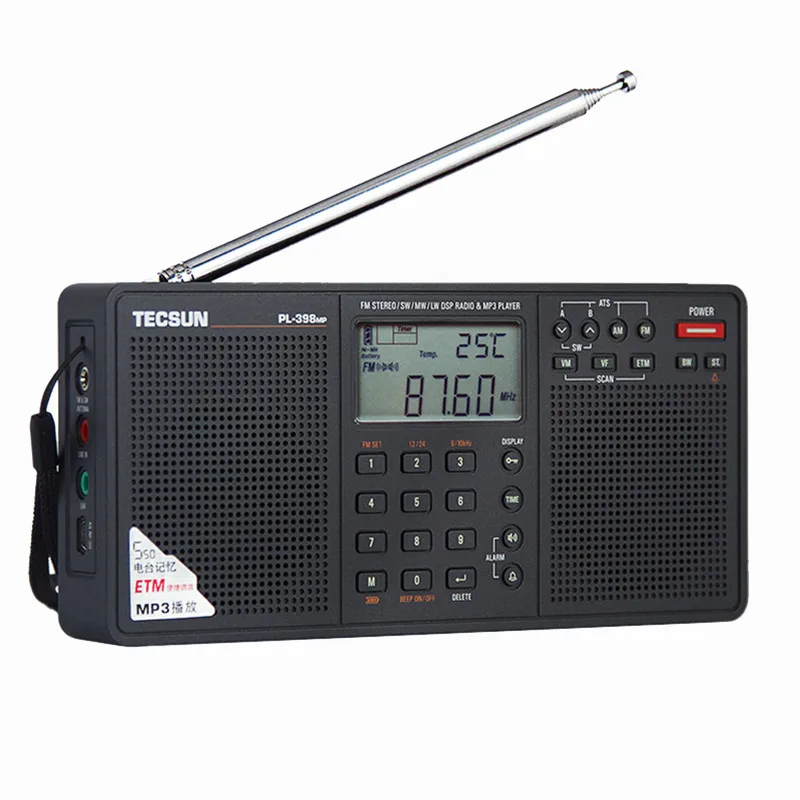 TECSUN PL-398MP-это многодиапазонное стерео портативное радио с функцией воспроизведения MP3 (слот для SD-карты). Он может слушать FM стерео, короткие волны, средние волны, Длинные волны вещания, воспроизводить MP3 музыку и имеет линейный вход. Может использоваться как активная маленькая колонка.