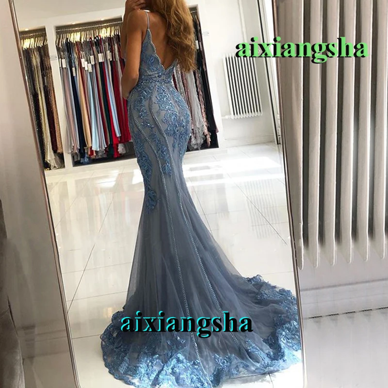 Светло-голубое сексуальное платье-Русалка на тонких бретельках с искусственными бусинами кружевной Дубай Саудовский арабский официальный наряд для торжественных случаев вечернее платье