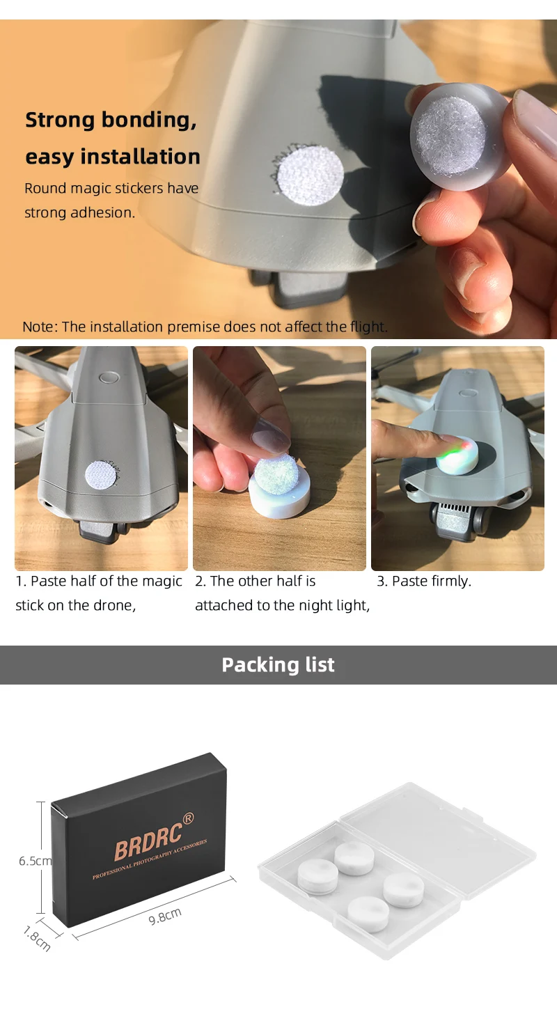 Характеристика:1. Цветной светильник, три основных цвета s, высокая яркость, безопасный и прочный, и сопровождение ночью,2. Установка и разборка простые и быстрые, не нужно беспокоиться о повреждении тела,3. С круглой пастой, сильной адгезией, не легко упасть,4. Батарея имеет кнопочную батарею, которая является небольшой и светильник.Описание:Материал: АБС-пластик,Применимые модели: для Mavic Air 2/Mavic Mini/Mini 2/Spark /Mavic Air/Mavic 2/Mavic Pro/Phantom 3/4,FPV ComboЦвет: белыйВес нетто: 11 г,Вес посылка: 33,5 г,Размер продукта: 2,2*0,8 см,Посылка Размер: 9,8*6,5*1,8 см.Упаковочный лист:4 шт. Ночной светильник,4 комплекта волшебных лент.