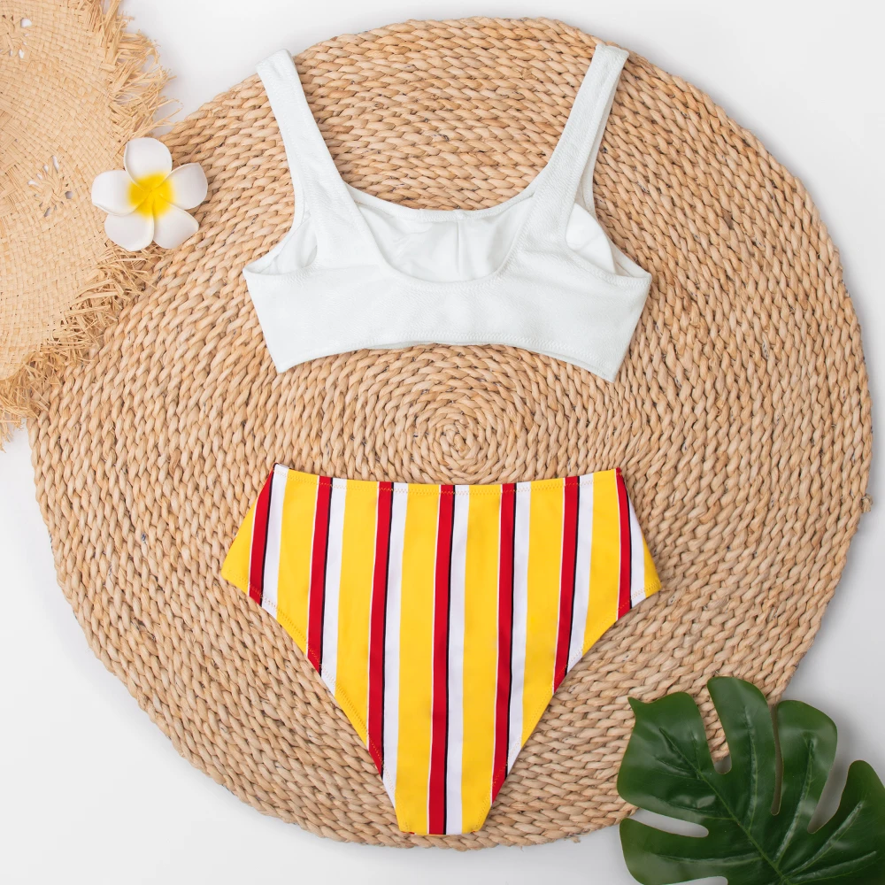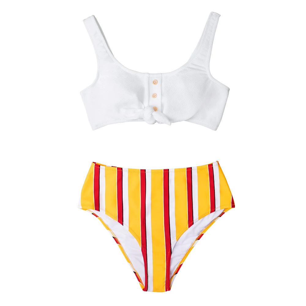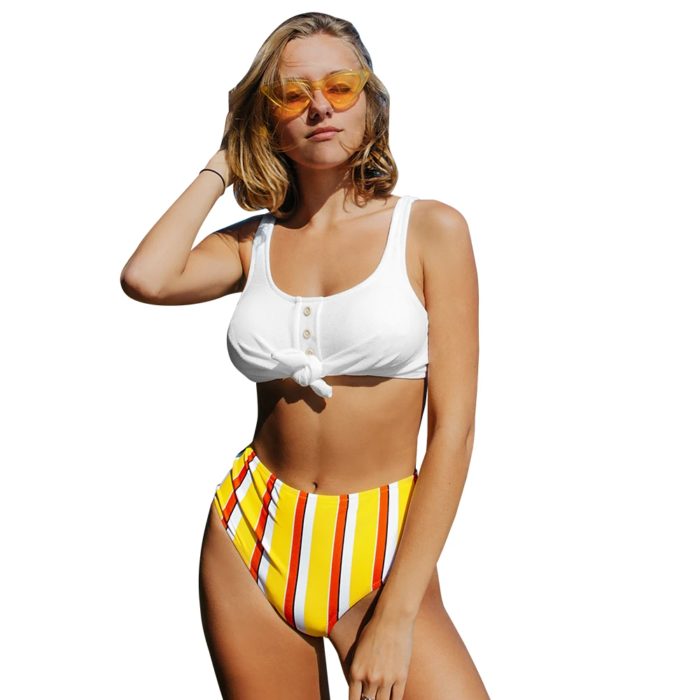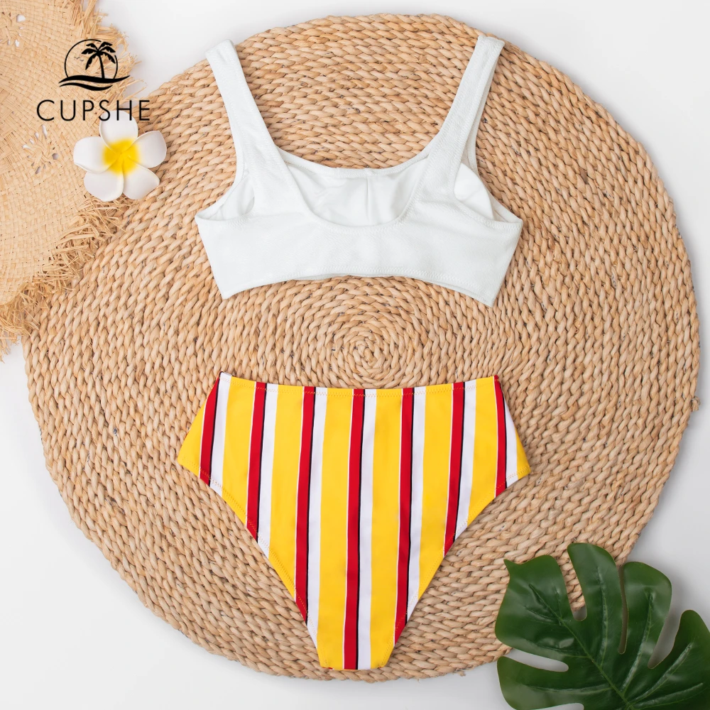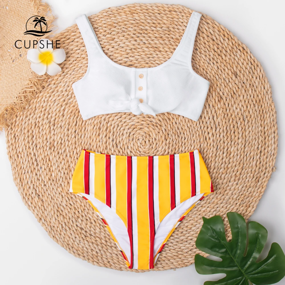 Комплект бикини CUPSHE Женский, белый, в желтую полоску, со средней талией, купальник из двух предметов, с завязками спереди, пляжные купальники, 2021