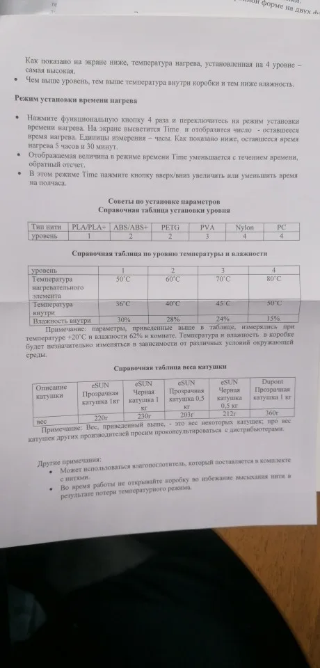 У этой сушилки заданы 4 режима сушки для разных пластиков. После 5 часов сушки килограммовая катушка ABS потеряла в весе 15 граммов. Значит, сушит хорошо. Спасибо!