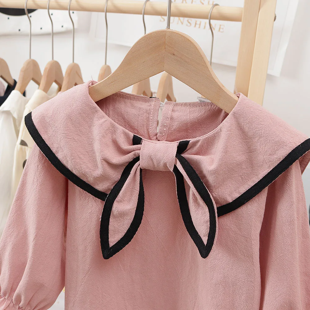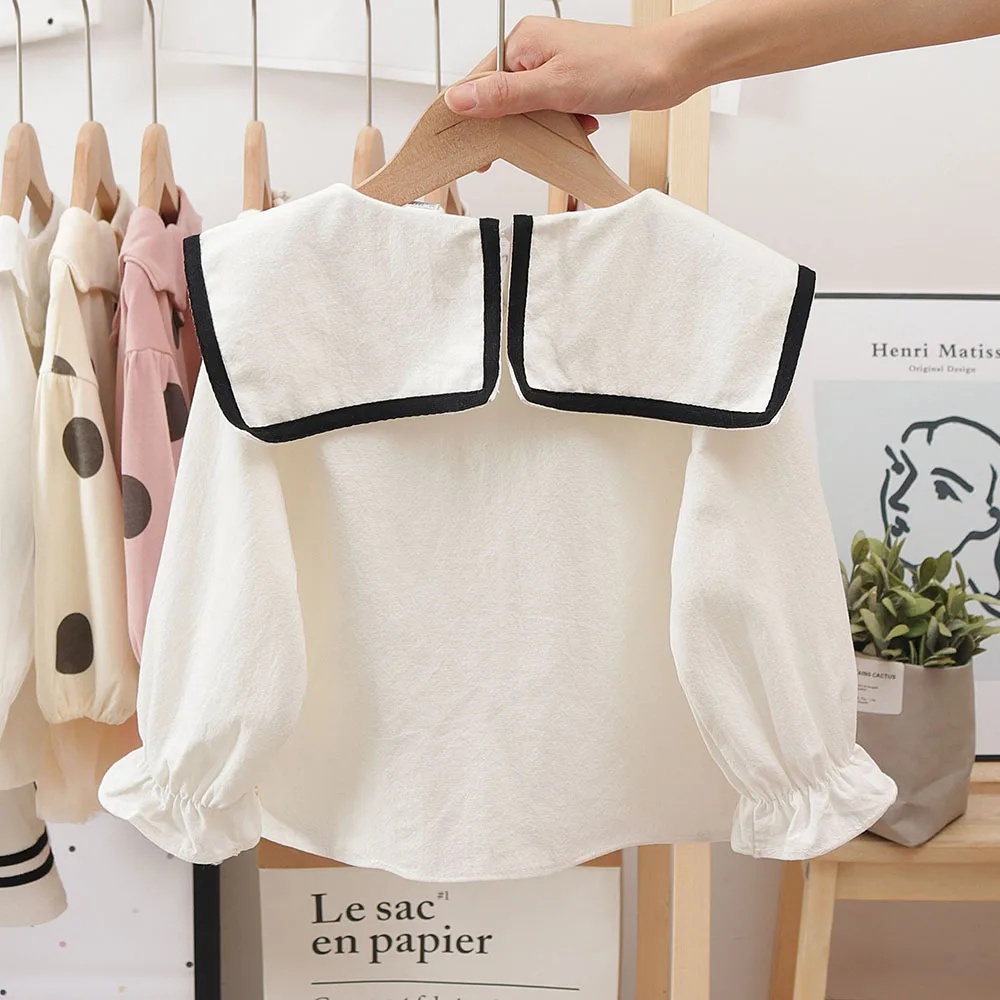 Белая блузка для маленьких девочек, топы с длинным рукавом, одежда на весну и осень, милая темно-синяя блузка с воротником для малышей, Повседневная Корейская рубашка с рукавами с рюшами