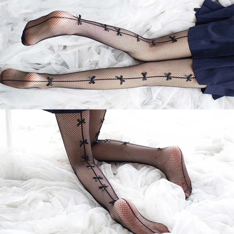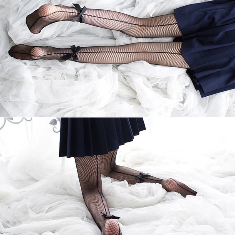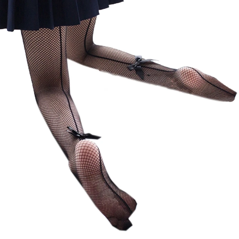 Для женщин пикантные открытые ажурные колготки ручной работы черный Сетчатое платье с бантом Колготки со швом сзади кавайные Чулки Нижнее белье