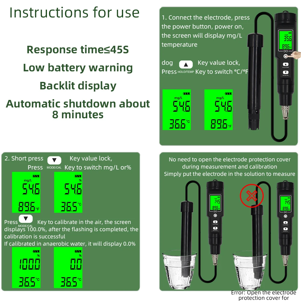 2. Этот растворенный кислородный метр имеет две единицы измерения: % и мг/л.