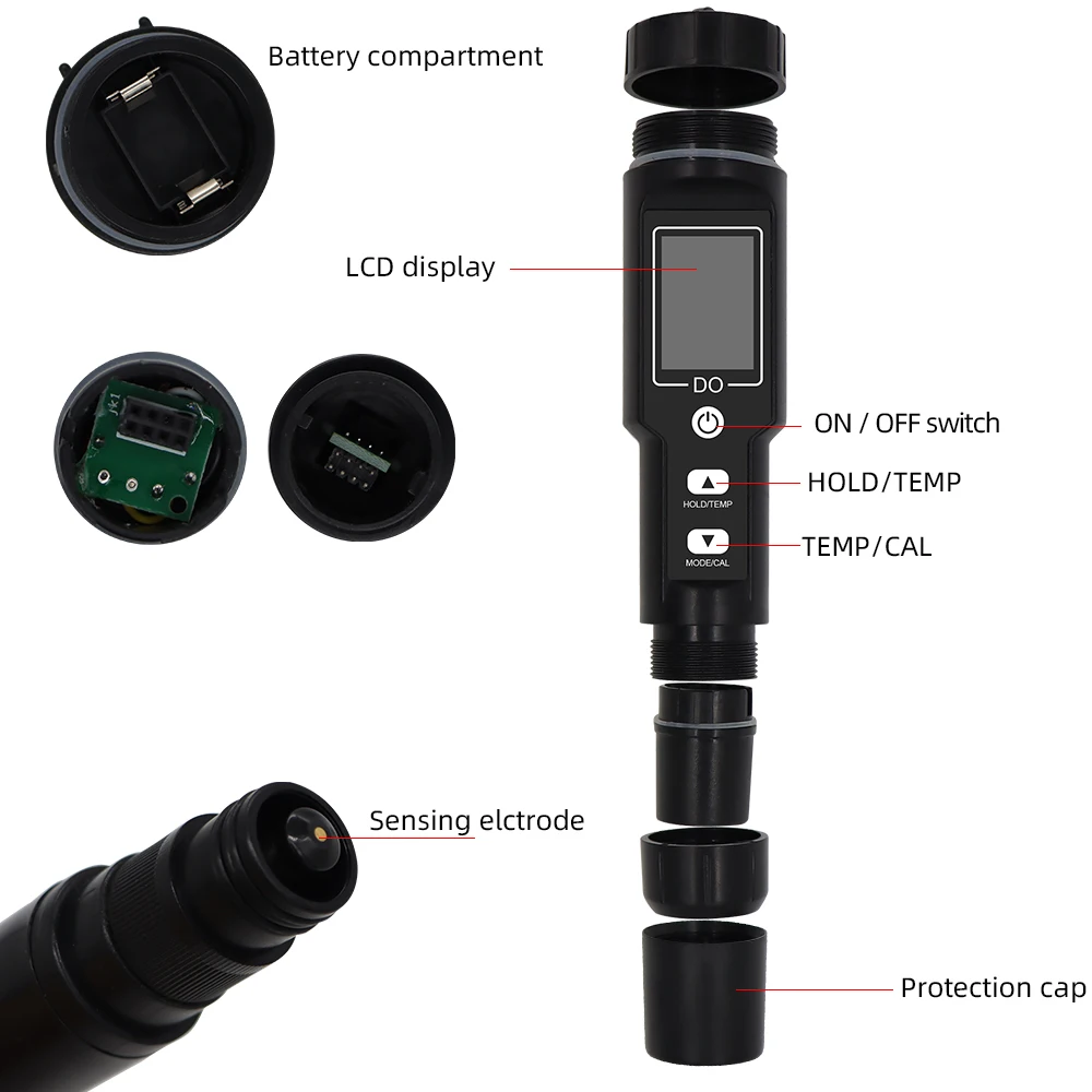 3. Растворенный кислородный зонд представляет собой пленку с поляризационным датчиком и термистором для измерения температуры и компенсации температуры. Проницаемая пленка отделяет измеренный раствор от чувствительного электрода, но позволяет кислороду проходить через пленку для реакции, растворимость может быть измерена.