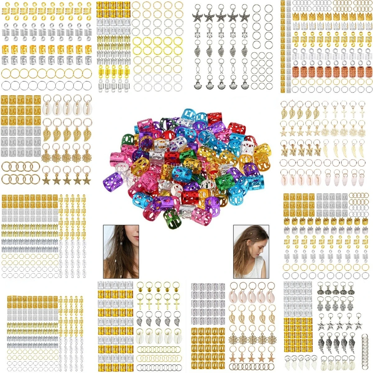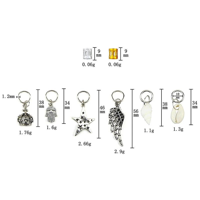 Посылка включает в себя:100 шт./компл.:25 x серебряные бусины дреды25 x золотые дреды бусины30 круглых колец5 x кольца ракушки5 х колец для листьев5 x кольца с колокольчикамиКольцо с крестами-5 шт.
