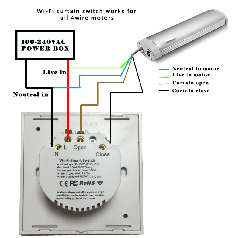 Пожалуйста, обратите внимание, что для вашего двигателя требуется не менее 3 проводов, 1 провод, 2 провода (для открытия и закрытия) и нейтральный провод, В противном случае он не может быть подключен к двигателю.Переключатель совместим с любым мотор для рольставни с электроприводом с входом напряжения 90-250 В переменного тока, 2200 Вт макс.. Как Somfy, Dooya, A-OK и т. Д., но нейтральный провод должен быть необходим для установки.