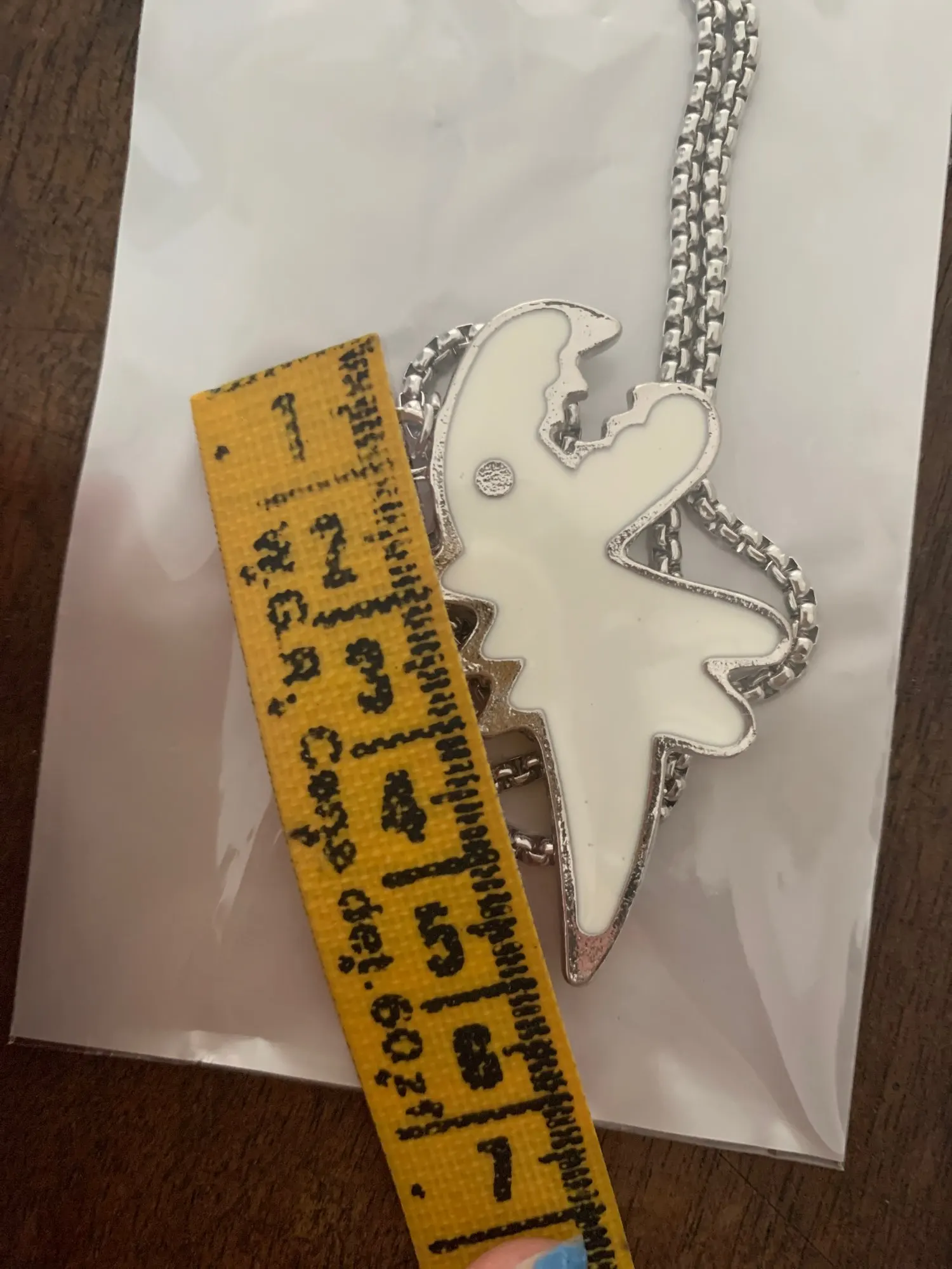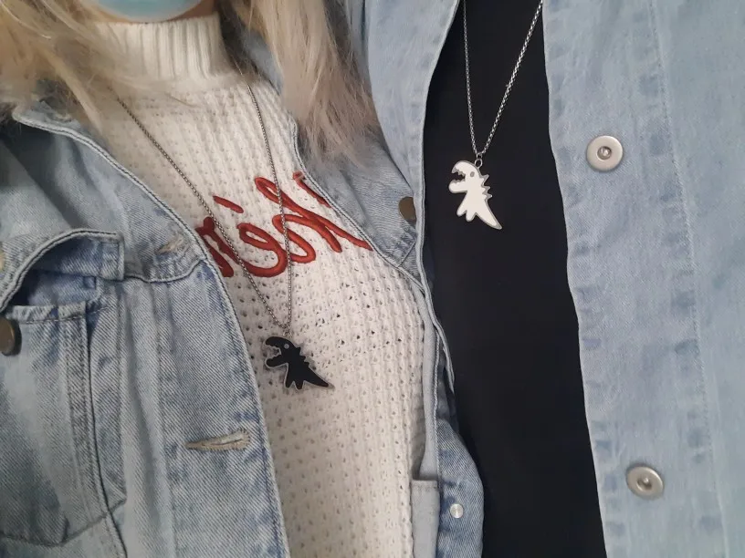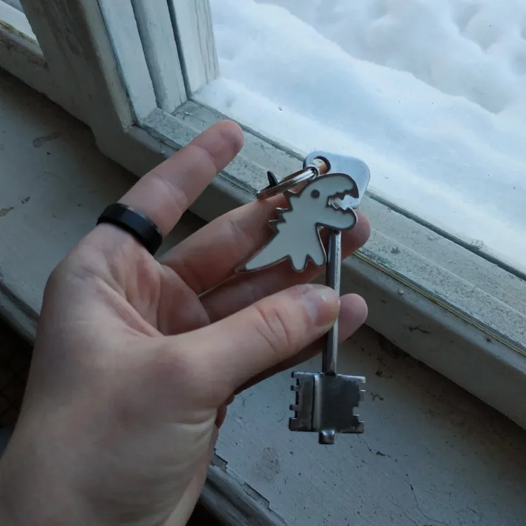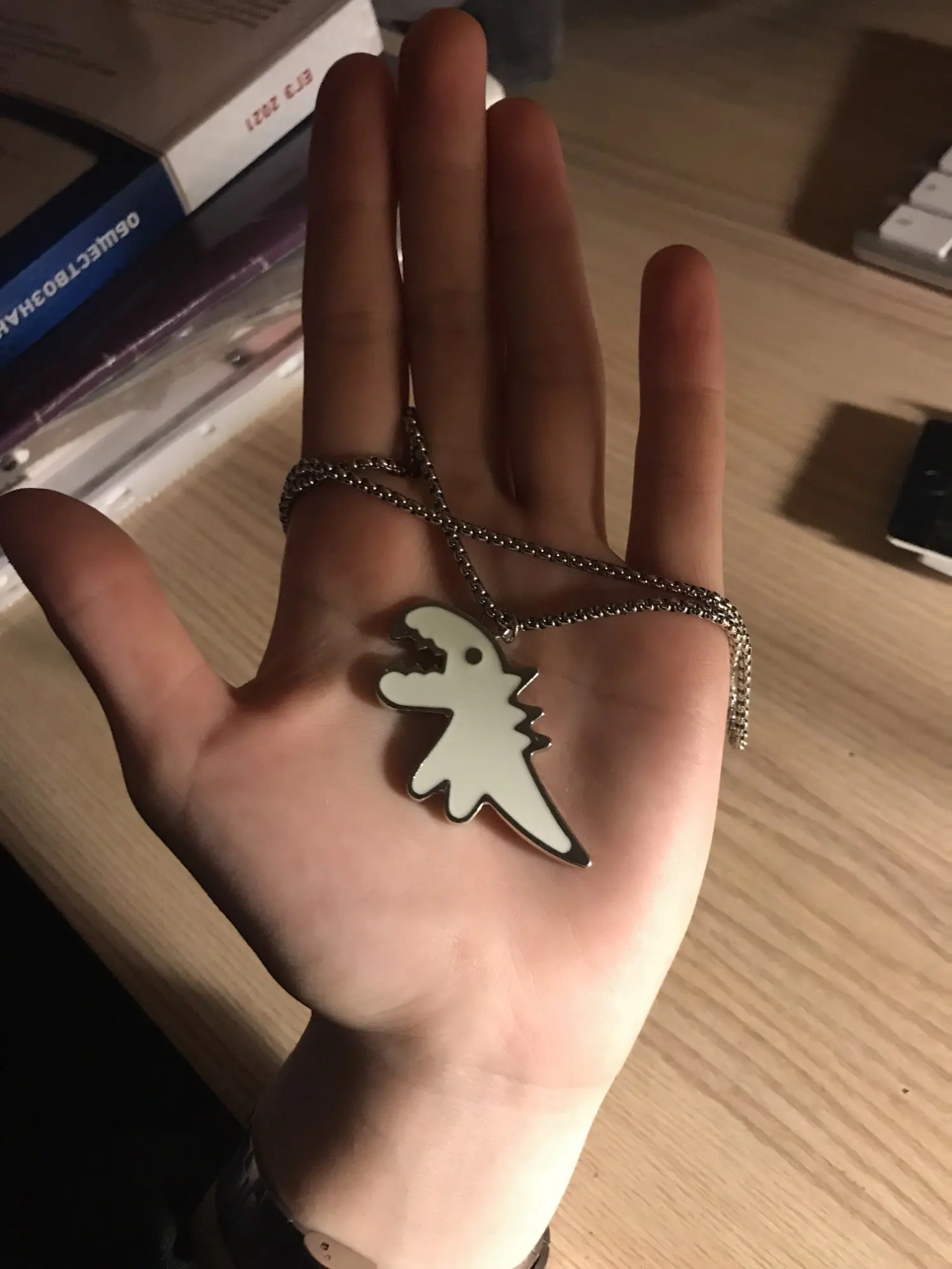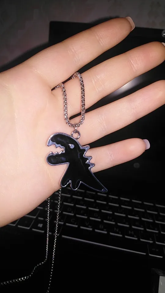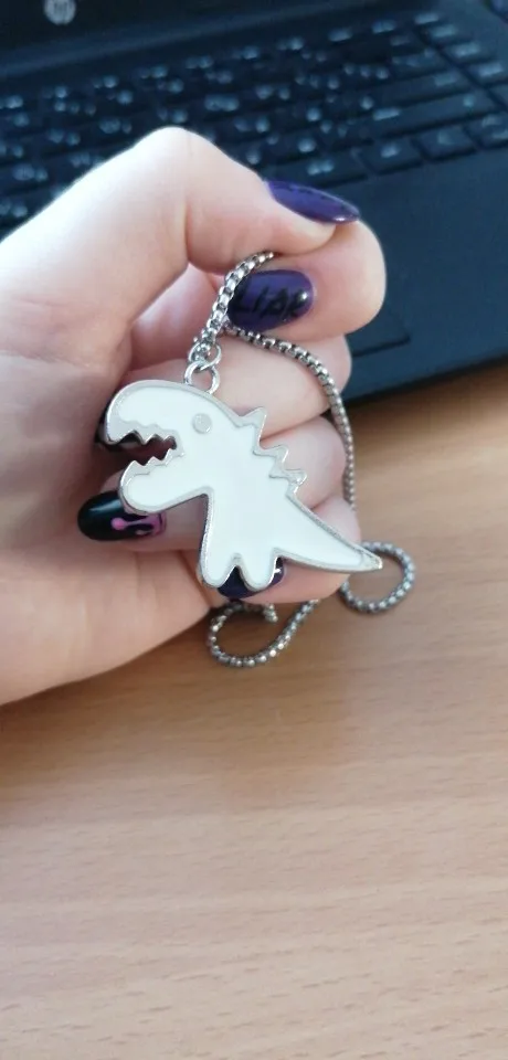 ну, в общем, разочаровалась я немного в посылке. думала динозаврик будет меньше, а он большой пипец. особенно цепочка :) ее длина не регулируется, висит ниже груди, смотрится как-то массивно слишком. расстроилась, но повесила на ключи, на них мило выглядит. но 230 рублей за брелок для ключей такое себе удовольствие