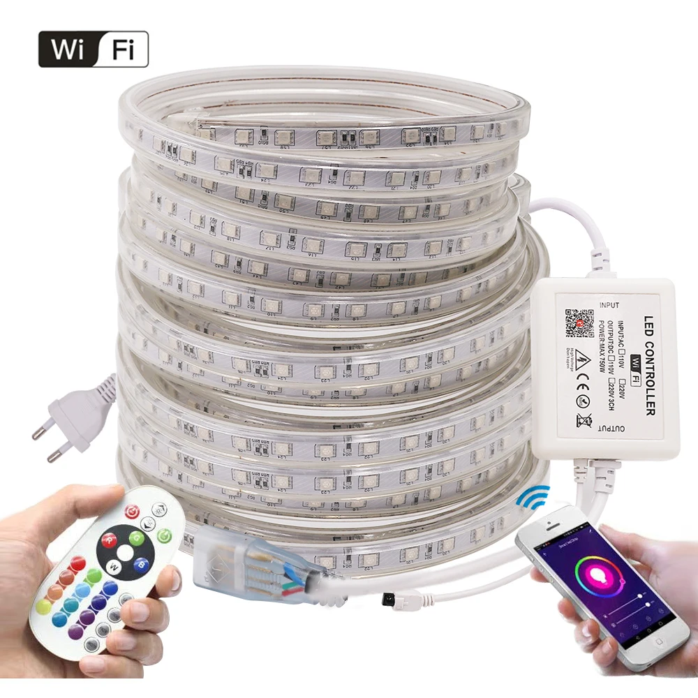 Светодиодная лента 5050 с Wi-Fi, 220 В, 110 В, RGB, 60 светодиодов, 24 клавиши, пульт дистанционного управления, гибкая светодиодная лента, водонепроницаемая, для ЕС, США, Великобритании, Австралии, комплект для праздничного украшения