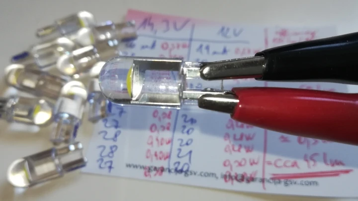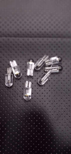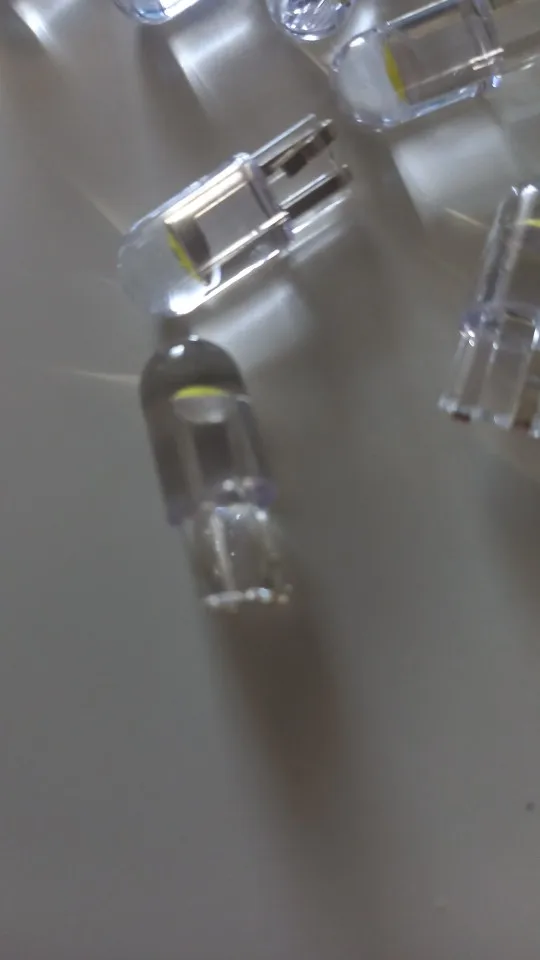 Белый свет, стеклянная колба. Яркость не самая высокая (ток потребления 20 мА), неплохое распределение света в передней полусфере. Со стороны очень похожа на оригинальную лампочку накаливания W5W.
