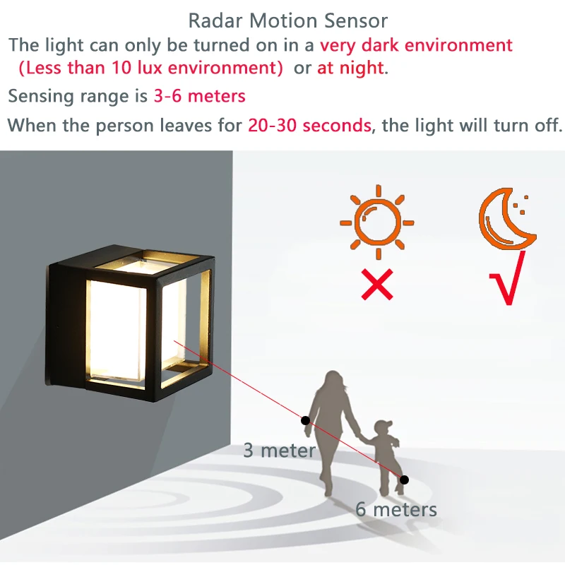 Датчик заключается в том, что после подключения лампы к напряжению 110-260 в светильник не загорается в течение дня. Ночью, человек идет в диапазоне 3-6 метров от лампы, светильник включен. После того, как человек покинет 3-6 метров, выключите лампу через 20-30 секунд.