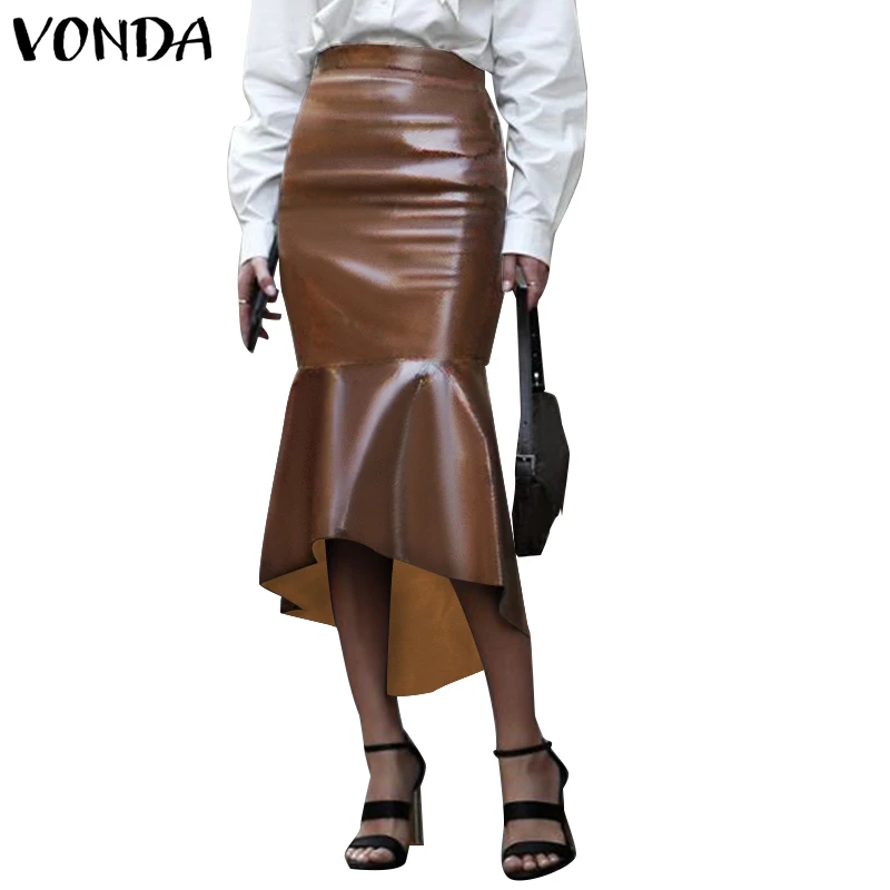 Элегантные женские офисные из искусственной кожи юбка сексуальное асимметричное вечерние юбка 2021 VONDA Высокая талия бедра длинные юбки Faldas De Mujer; Большие размеры