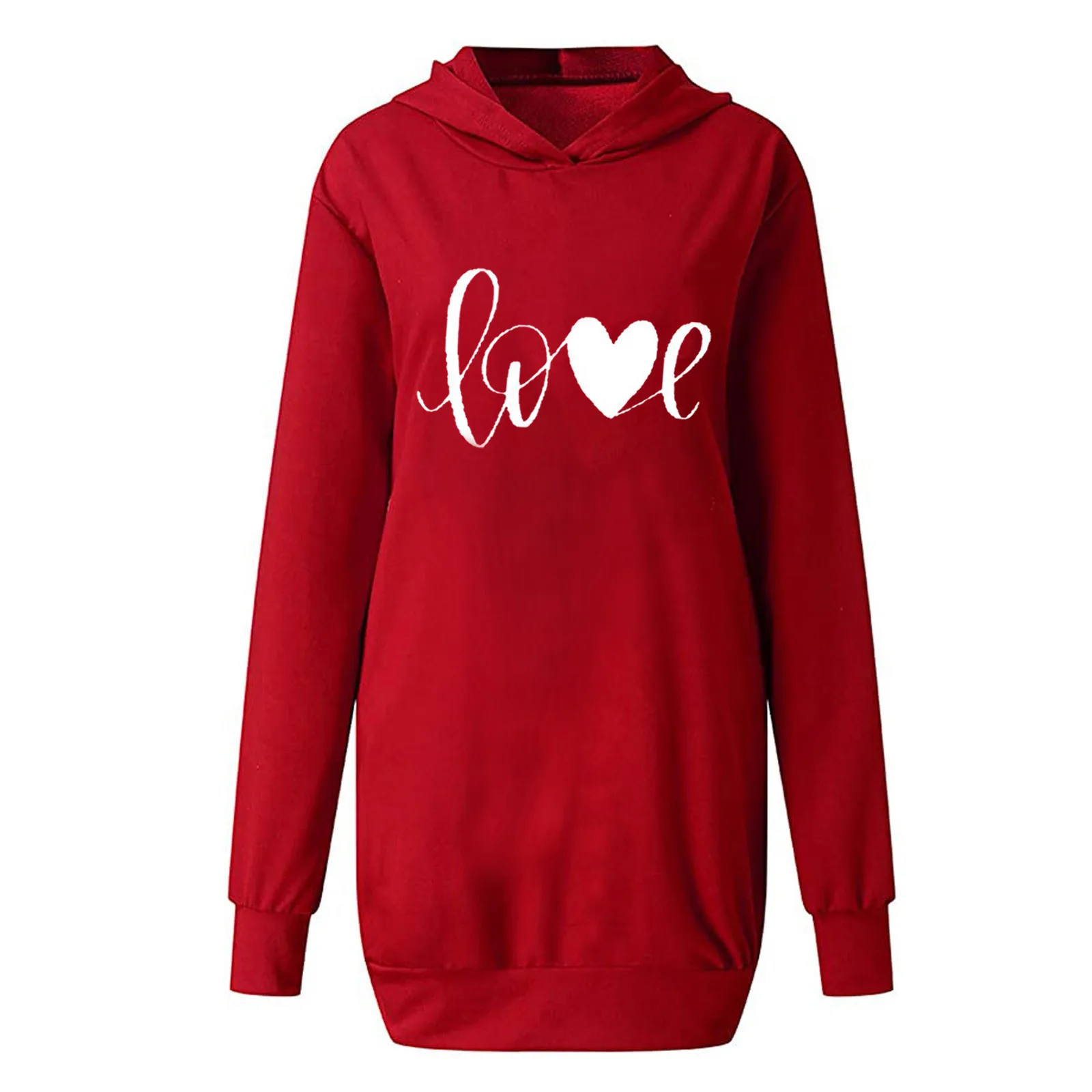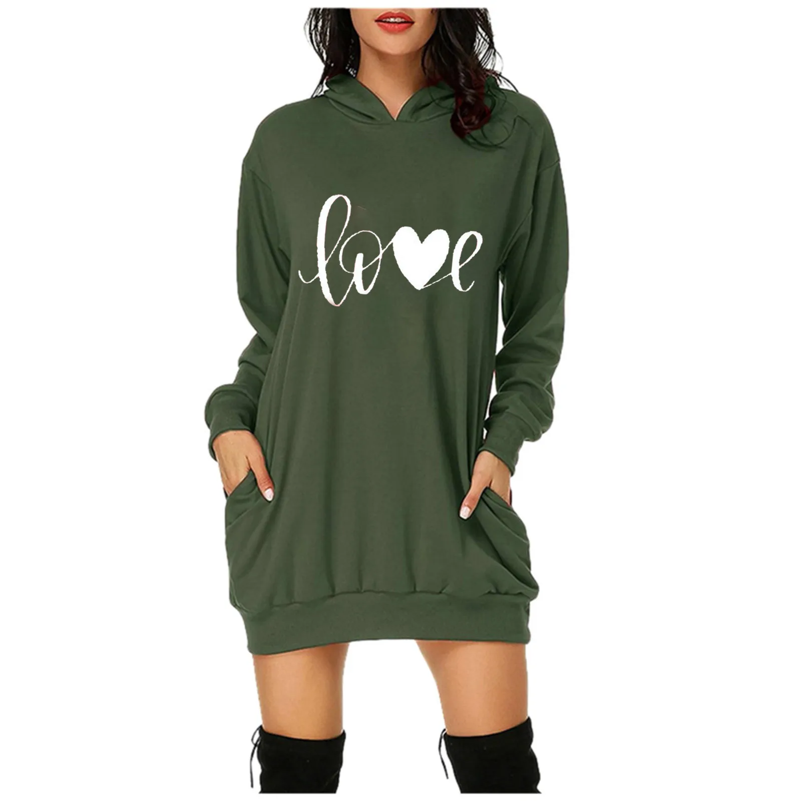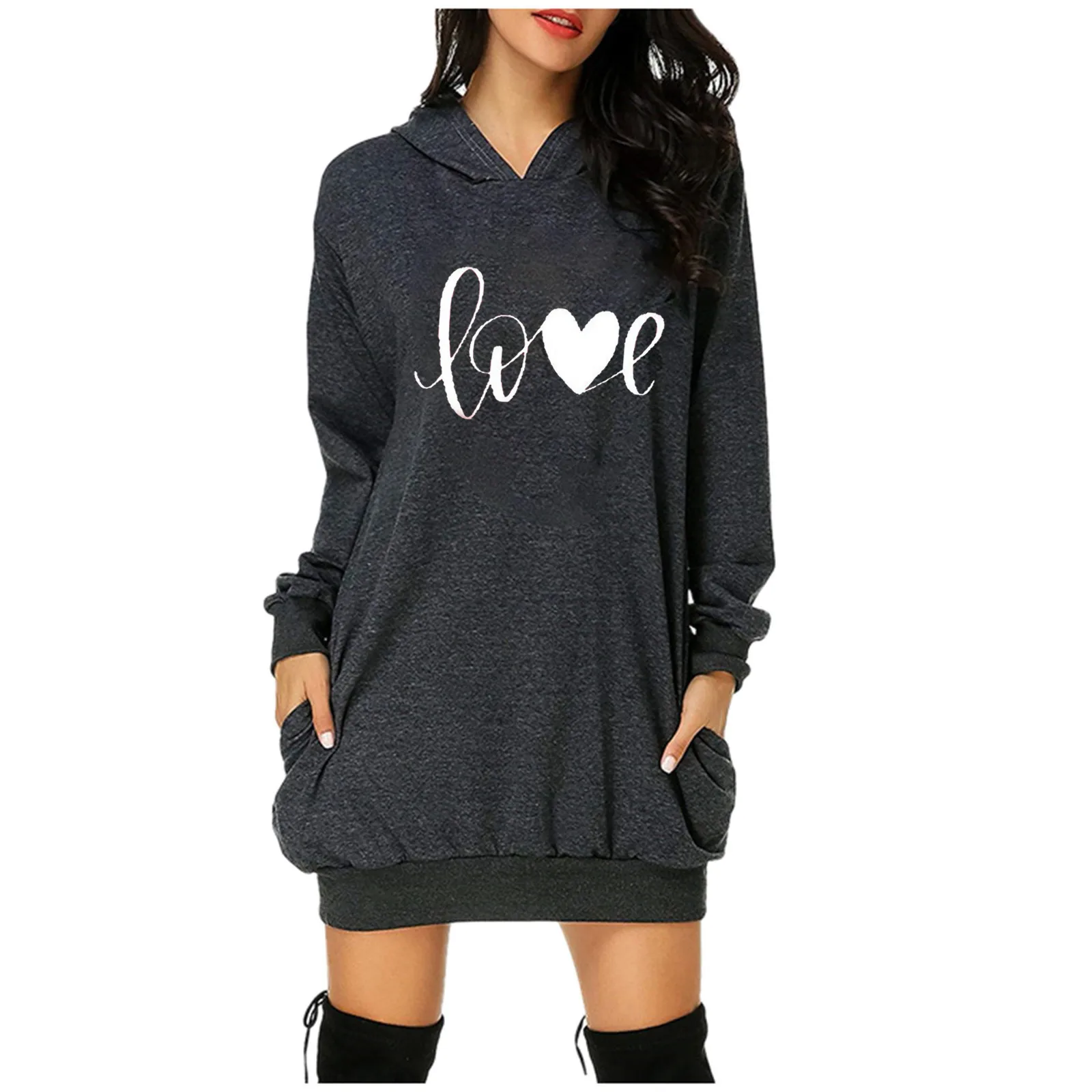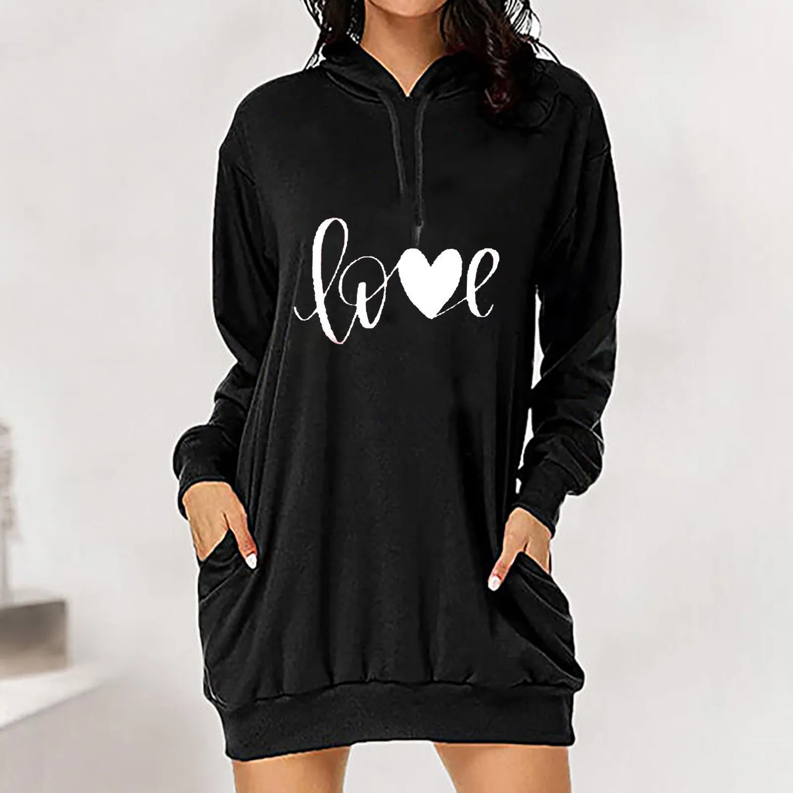 Модель сезона осень-зима 2021 года, модные женские платья на День святого Валентина, платье-свитшот свободного кроя с капюшоном и карманами, украшенное принтом сердечек, # t2g