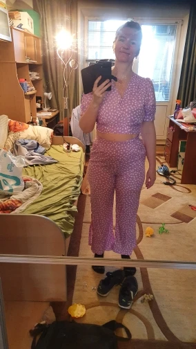 Доставка-10 дней. Талия 72-74, рост 158. И все подошло. ! Штаны порезали, но если вам они коротки, то их можно распустил(сантиметров 8 в запасе). Штаны на резинке и молние. В комплекте идут кнопки, если вырез будет слишком глубоким(но мы просто зашили его немного)ткань приятна. Я довольна покупкой!!