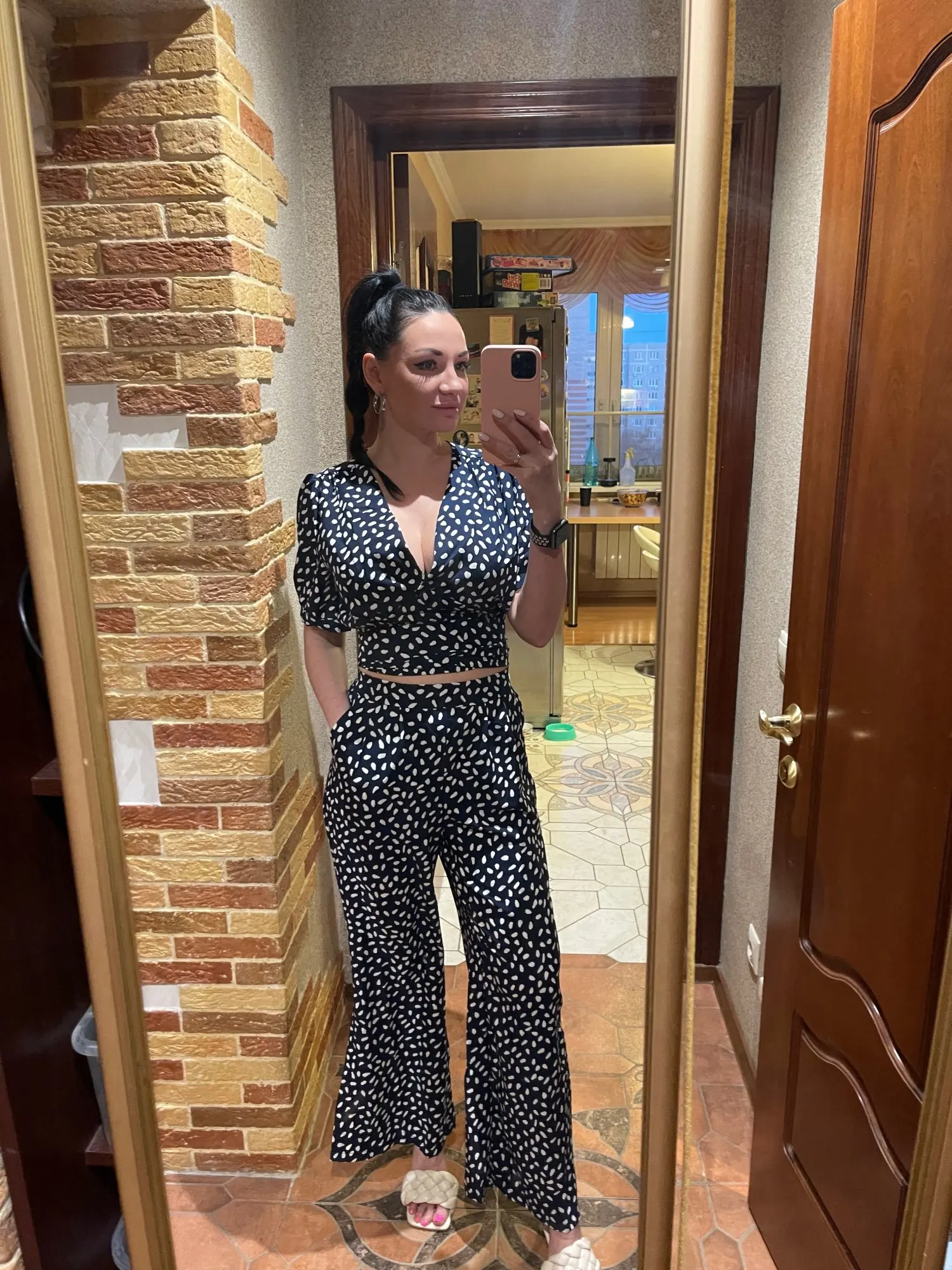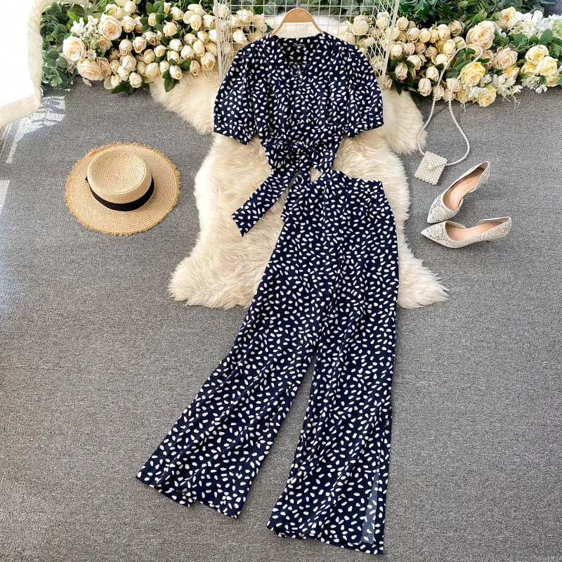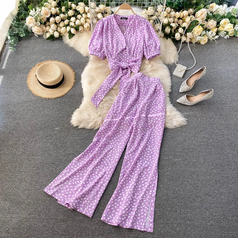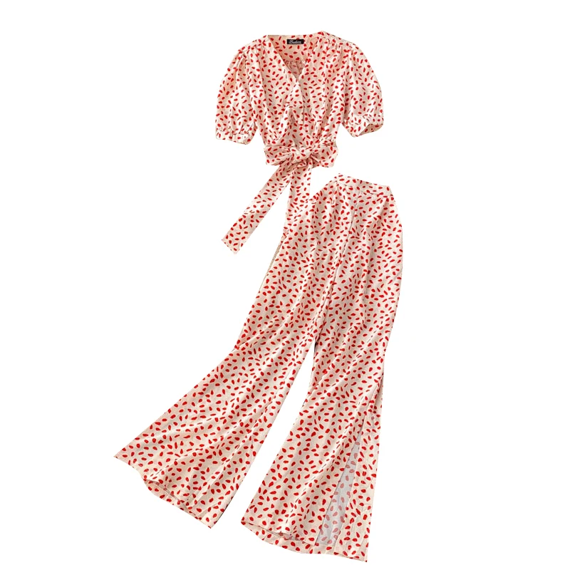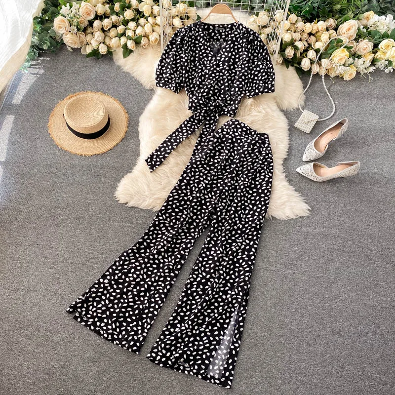 Женский комплект из двух предметов, короткий топ с V-образным вырезом и пышными рукавами, широкие брюки с высокой талией, в стиле бохо, на лето 2021, UK877