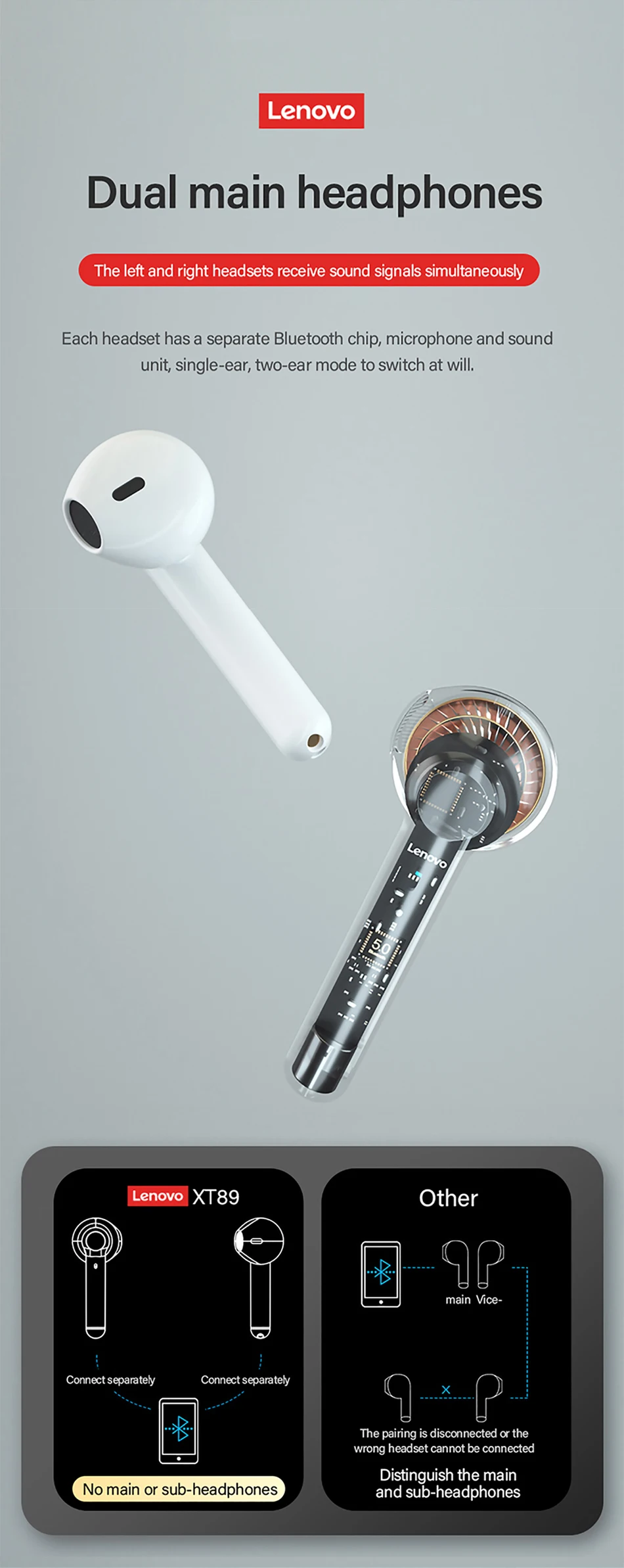 TWS-наушники Lenovo XT89 с поддержкой Bluetooth 5,0 и защитой класс...