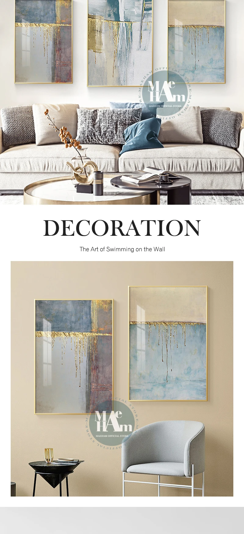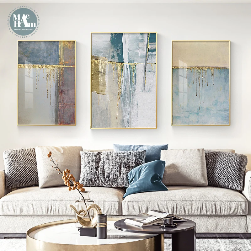 Абстрактный синий акварель холст печать картины золотые линии плака...