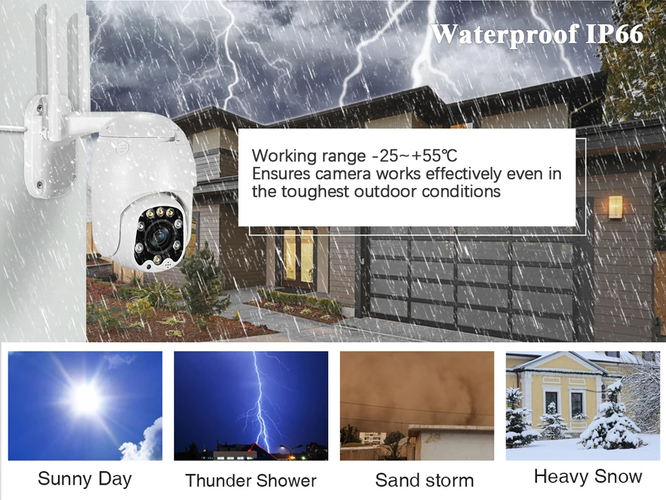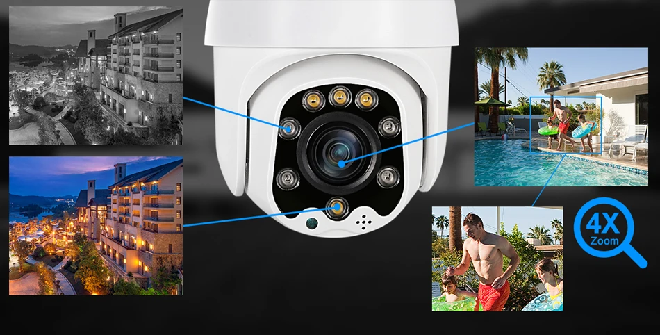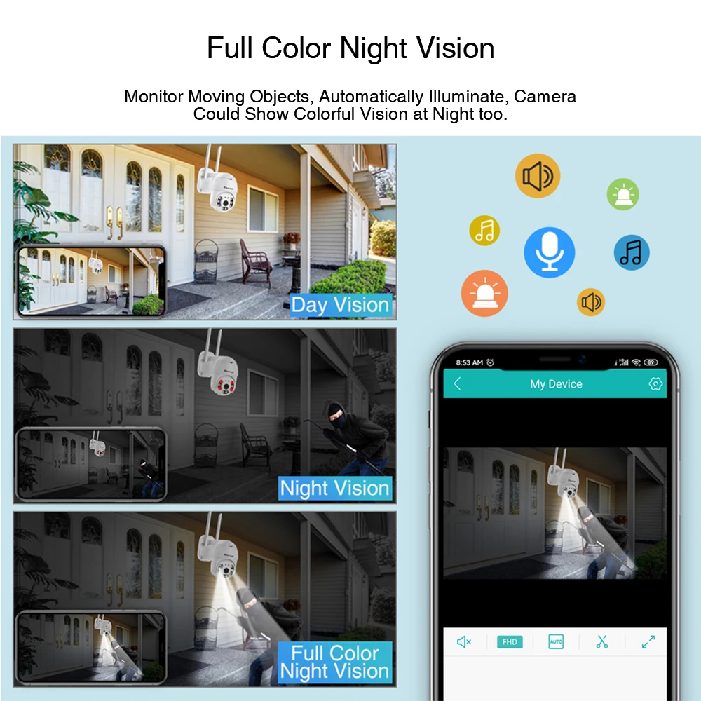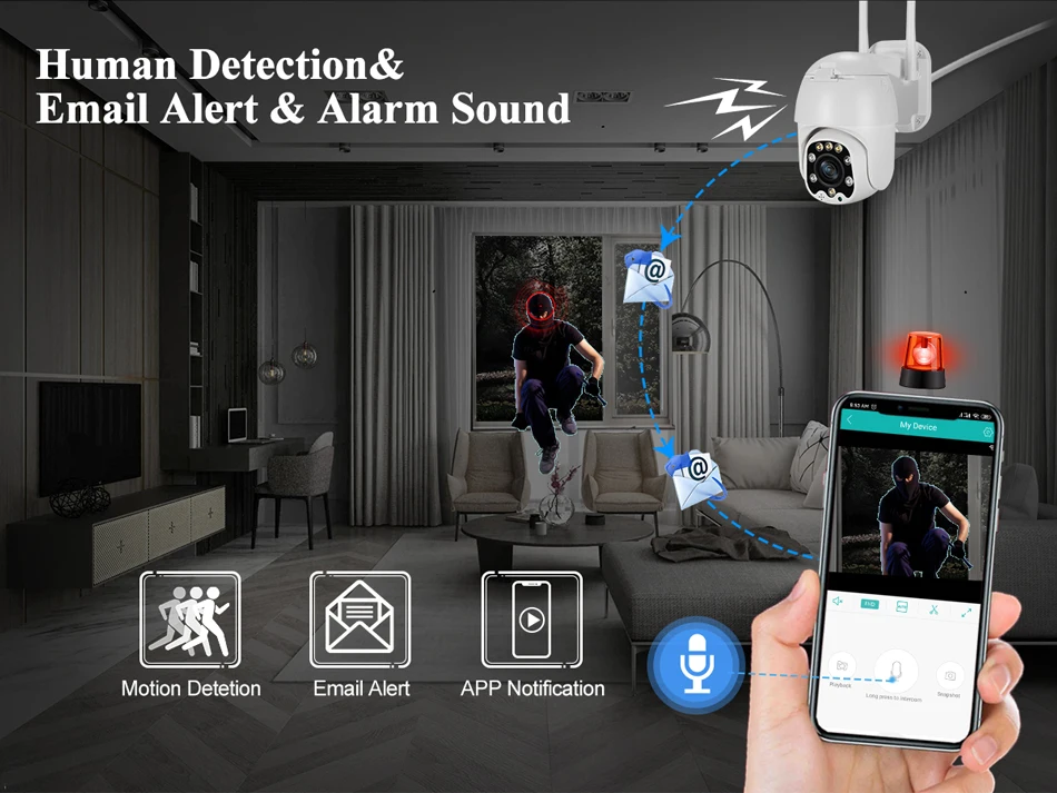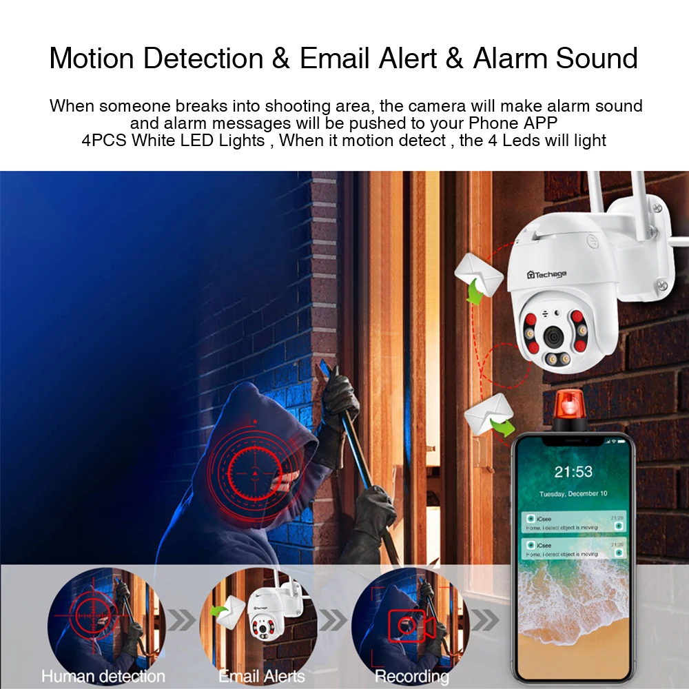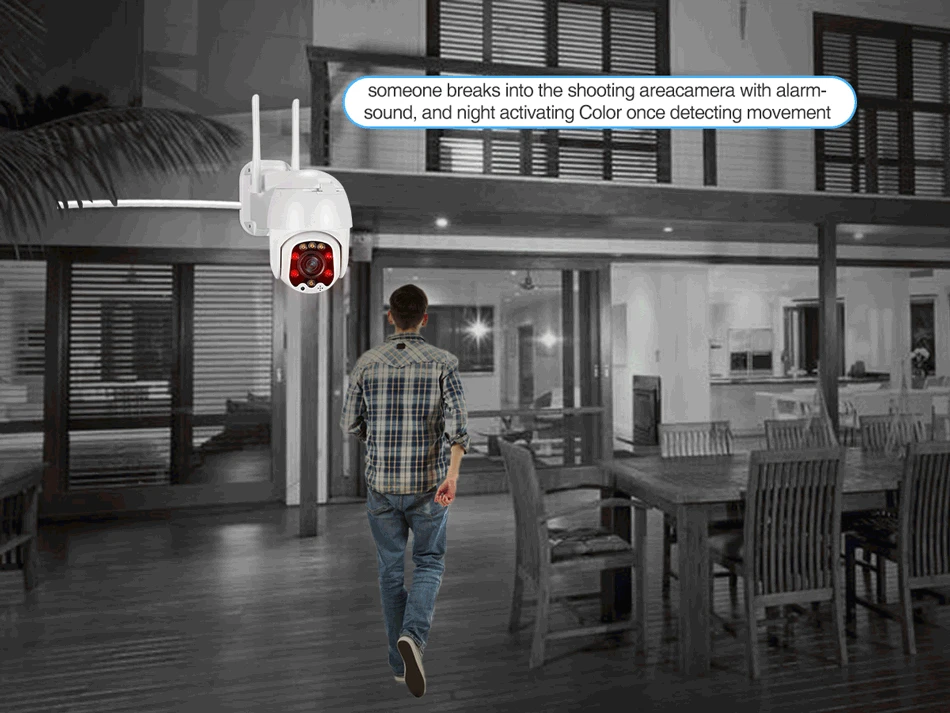 Когда кто-то ворвется в область съемки, камера сделает звуковой сигнал и сигнал тревоги будет передвинут в приложение вашего телефона.И когда он обнаруживает движение, 4 белый светодиодный светильник s будет светильник, показывая вам цвет ночной сцены.