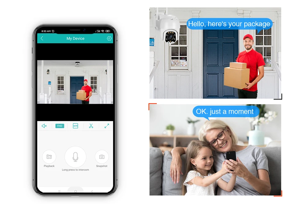 Камера подключена к микрофону и динамику, вы можете общаться со всеми через ваш смартфон удаленно, когда захотите.