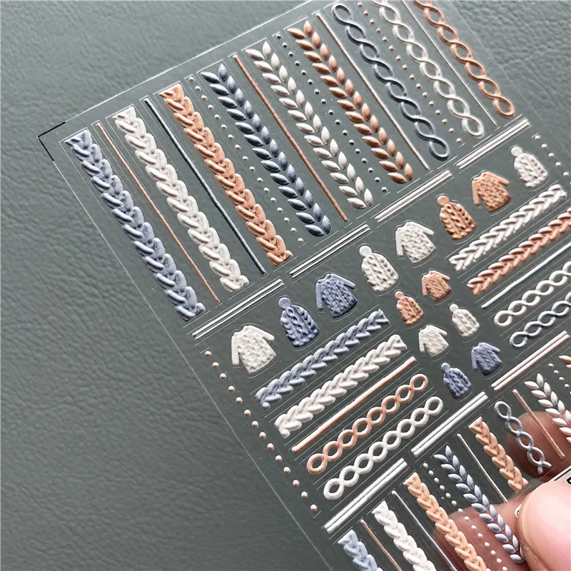 3D вязаные ногти наклейка вязаный свитер гравировка наклейка Роза бабочка крыло перо наклейка для ногтей тисненые фотонаклейки