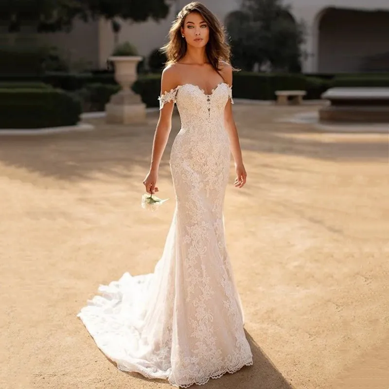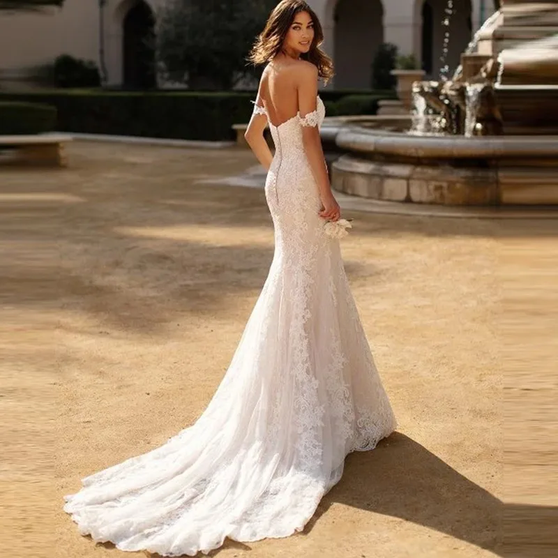 Женское свадебное платье с юбкой-годе, открытыми плечами и шлейфом