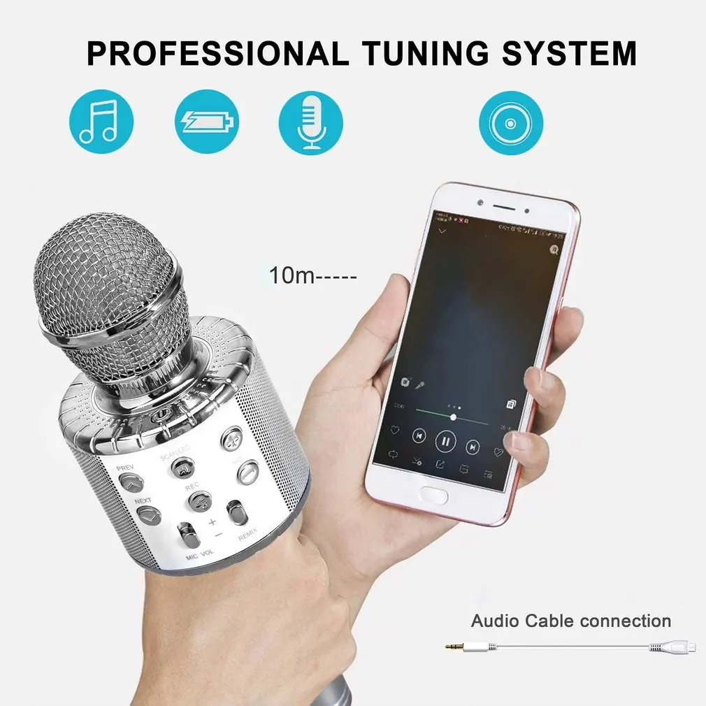 1. Беспроводная технология для снижения энергопотребления.2. Стабильное соединение и более высокая скорость передачи, эффективное беспроводное рабочее расстояние до 10 м.3. Он может подключаться к любым включенным смарт-устройствам.4. Использование: микрофон караоке/диктофон/динамик/громкоговоритель.Описание:Это BKTV- WS858 беспроводной караоке ручной микрофон, мульти караоке плеер.Характеристики: модель изделия: ws-858Вес продукта: 0,3 кгМощность динамика: 4Ω 3 ВтОтношение сигнал-шум: ≥ 85 дБЧастотный диапазон отклика: 150 ~ 20 кГцАудио-интерфейс источника: 3,5 мм стерео разъем для наушниковРазмер изделия: 22.5x7.6x7.6 смПосылка включает в себя:1 х KTV беспроводной караоке ручной микрофонПримечания:1. Из-за разницы между различными мониторами изображение может не отражать фактический цвет изделия. Мы гарантируем, что модель реального изделия не отличается от представленной на фото.2. Возможны незначительные отклонения в размерах из-за различных измерений вручную.