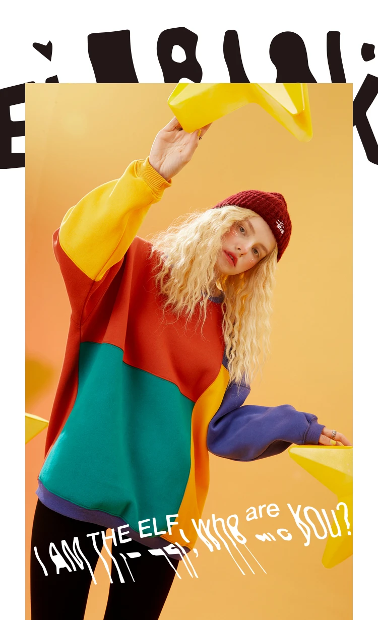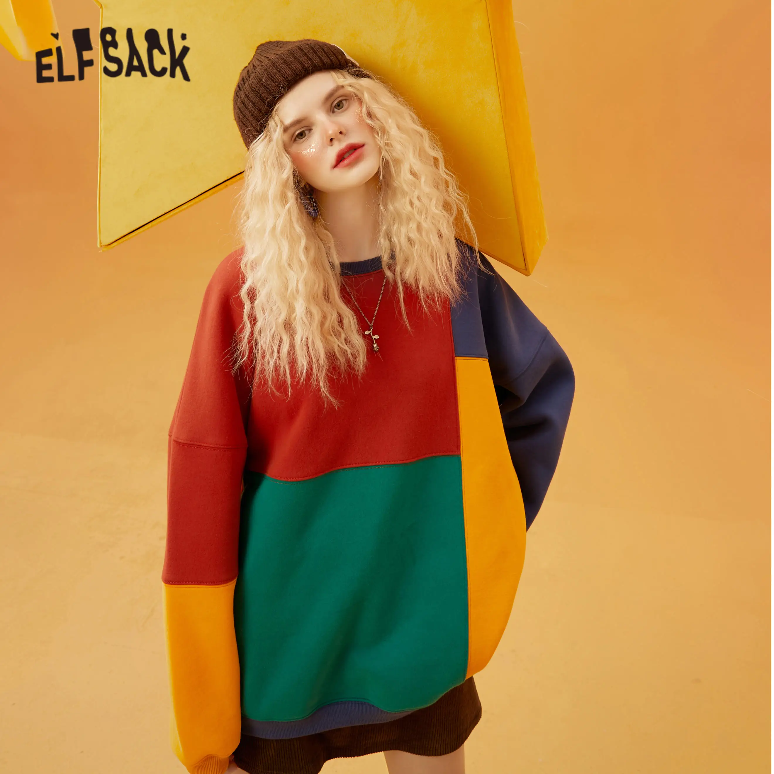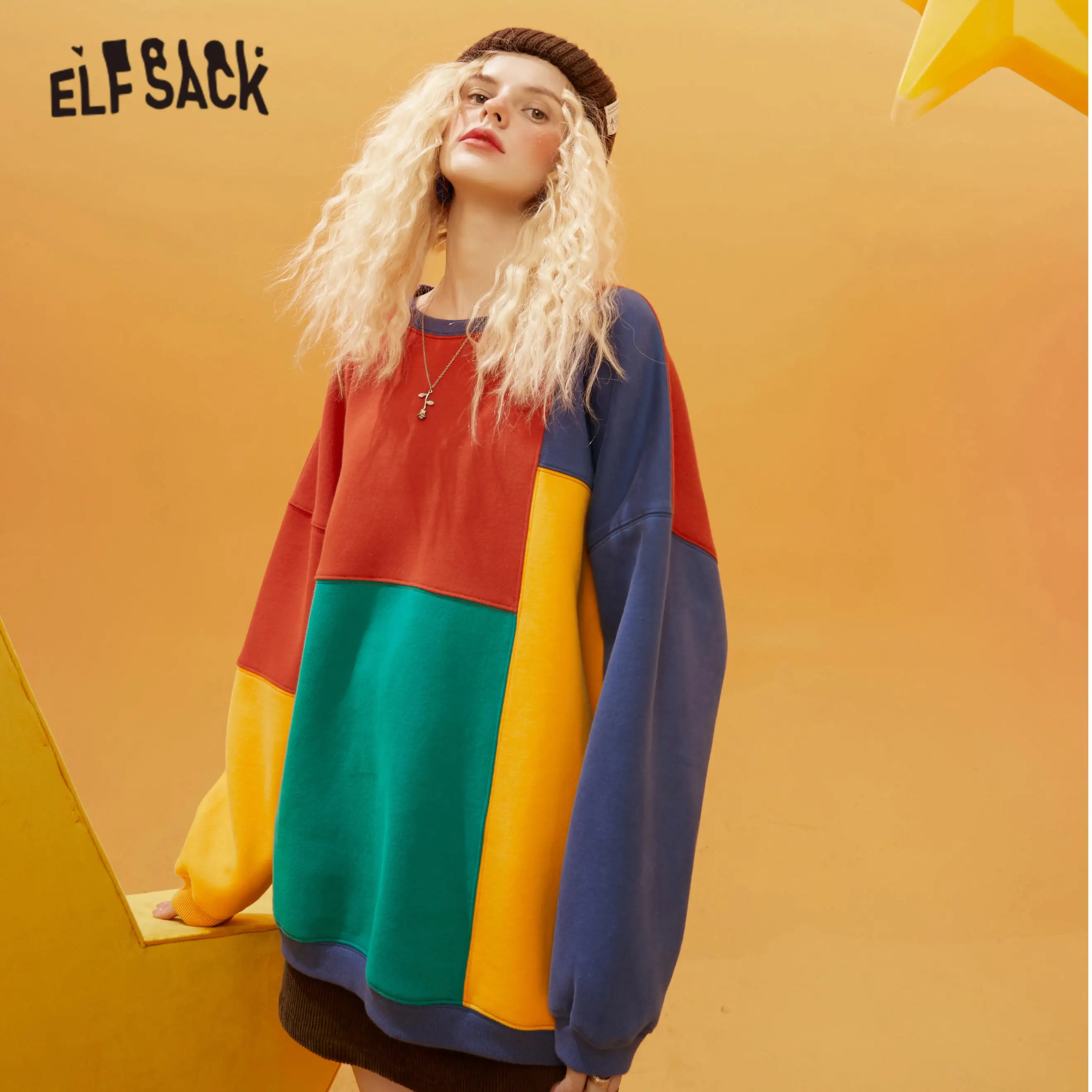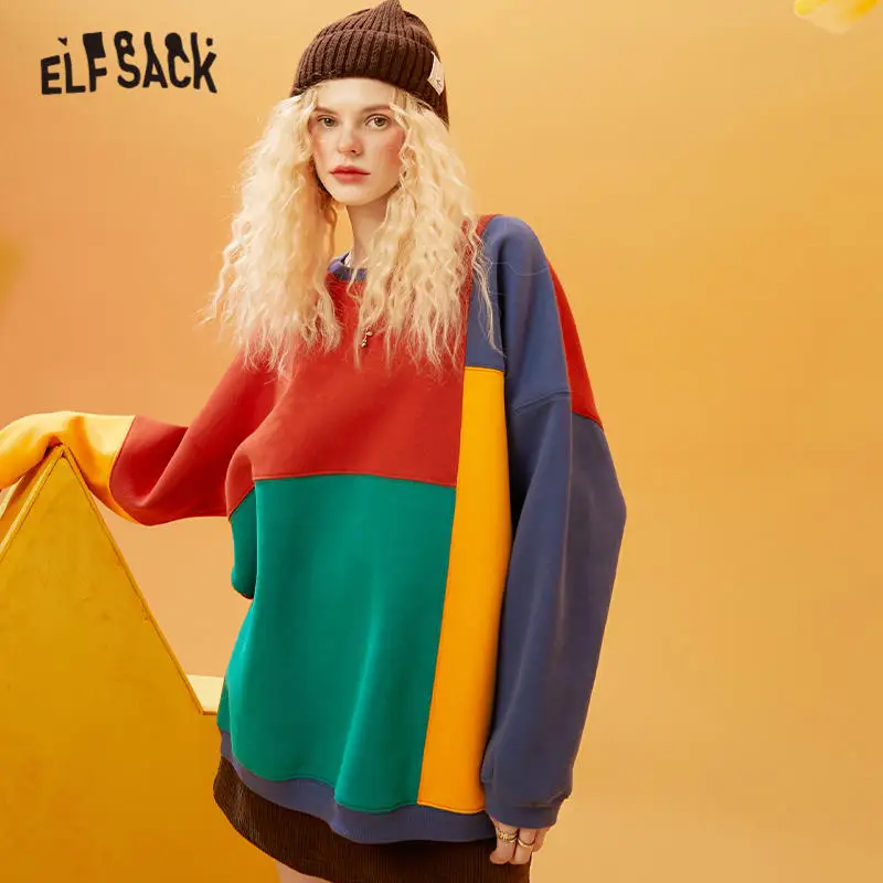 Женский Повседневный пуловер большого размера ELFSACK, Свитшот в стиле КолорБлок в стиле Харадзюку, зима 2021